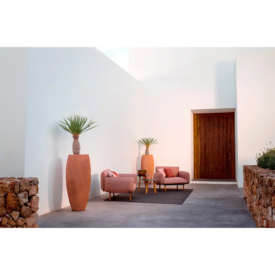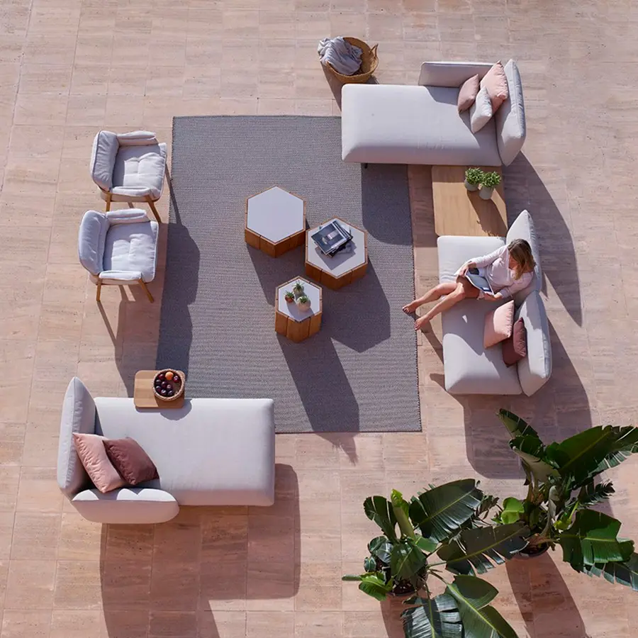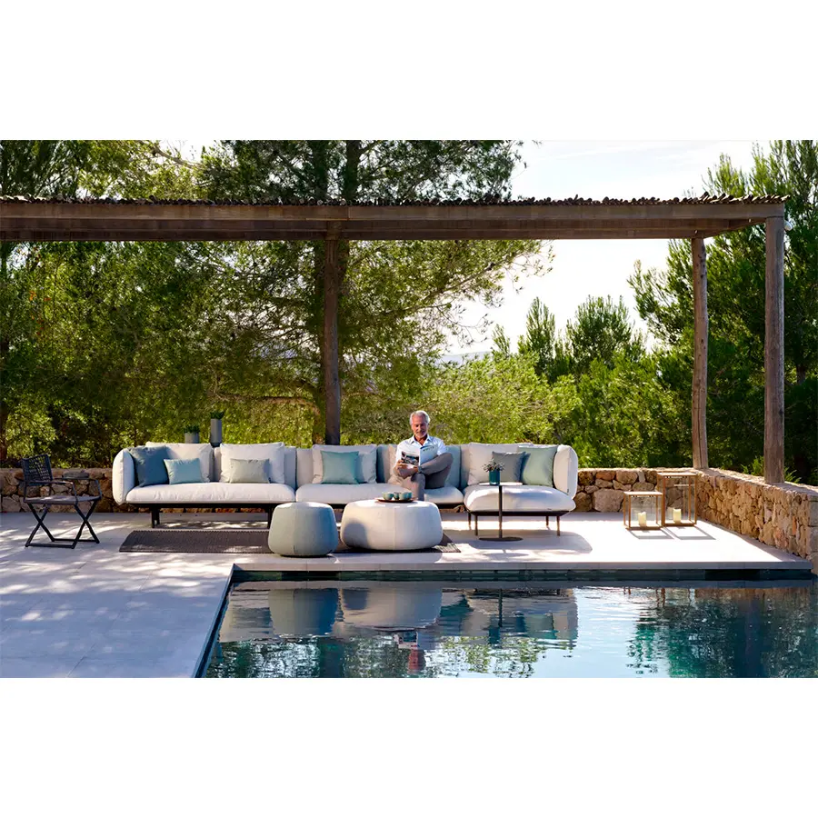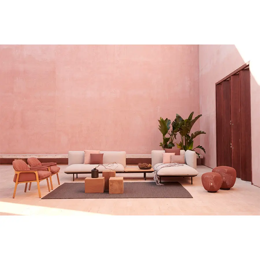 Senja incluye los habituales cojines de asiento o su variante extraprofunda. El abundante relleno les da una forma agradable y orgánica, rematada con un ribete. La estructura de aluminio con revestimiento en polvo, en lino o wengé, sostiene una robusta y duradera base sobre patasde teca o aluminio a juego.