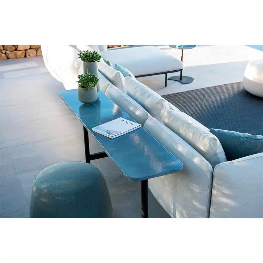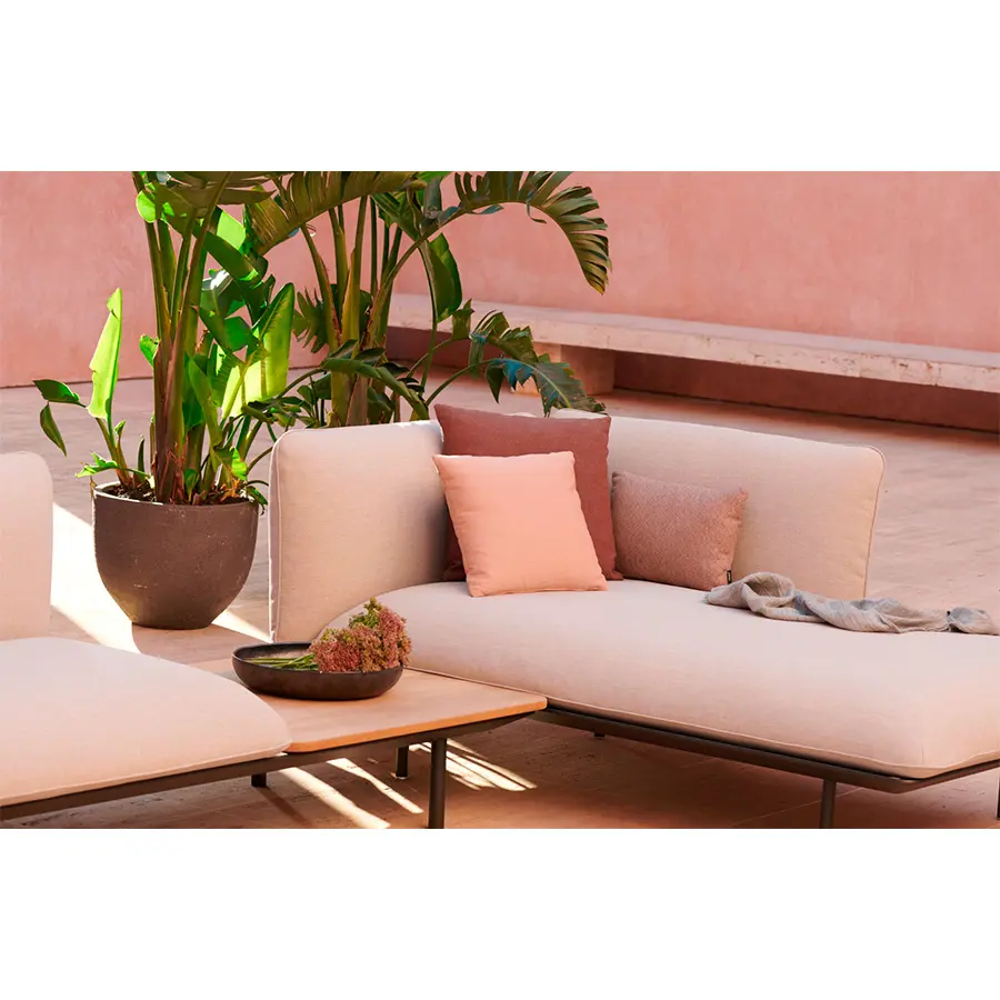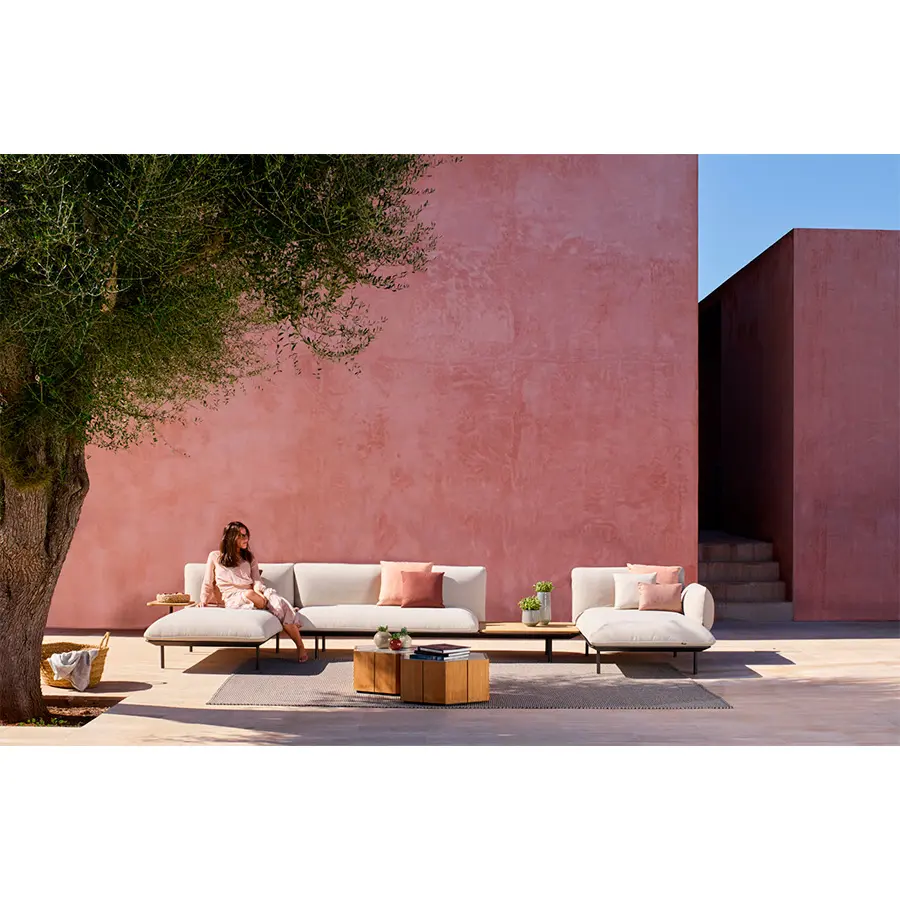 El sofá modular Senja te invita a acurrucarte y relajarte. El diseño altamente flexible te permite combinar un módulo de uno, dos o tres asientos con brazos altos o bajos. Las mesas integradas, en color linen u ocean, de teca o de piedra de lava esmaltada, se pueden colocar en cualquier lugar, lo que te permite tener al alcance de la mano todo lo que necesitas. Las delgadas mesas de consola fijadas detrás del sofá y las elegantes mesas laterales personalizan aún más la decoración.