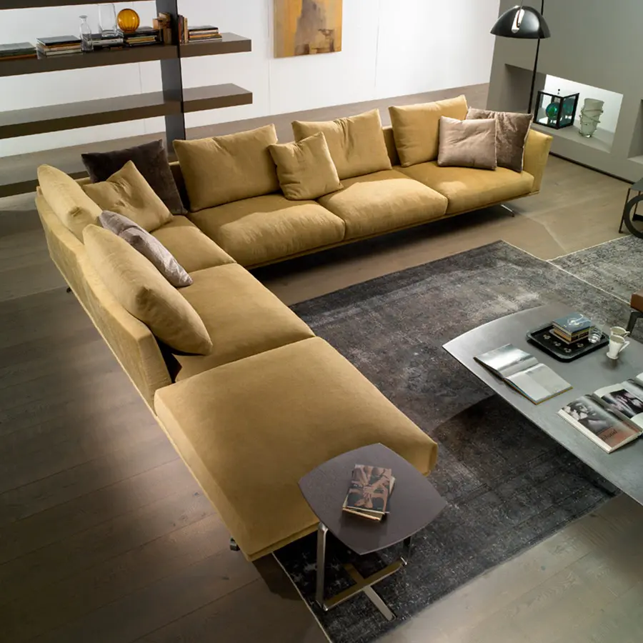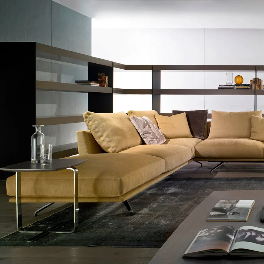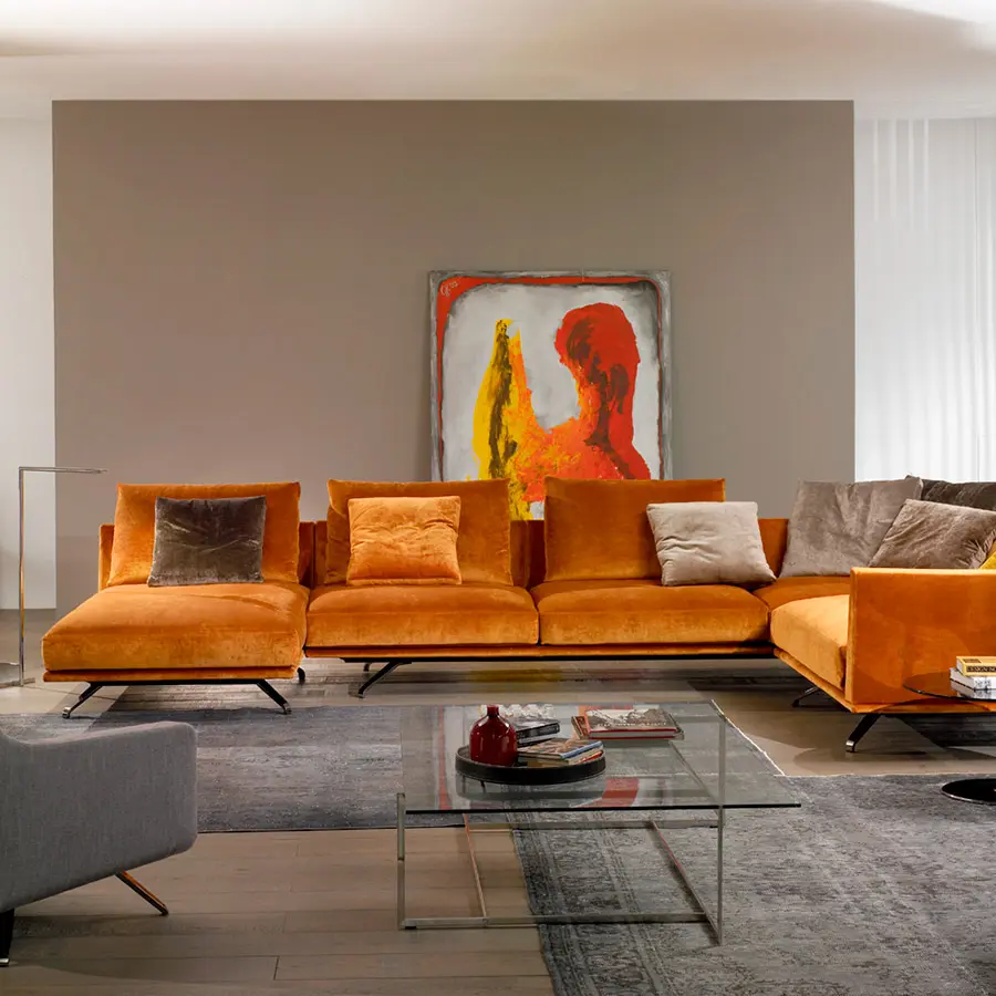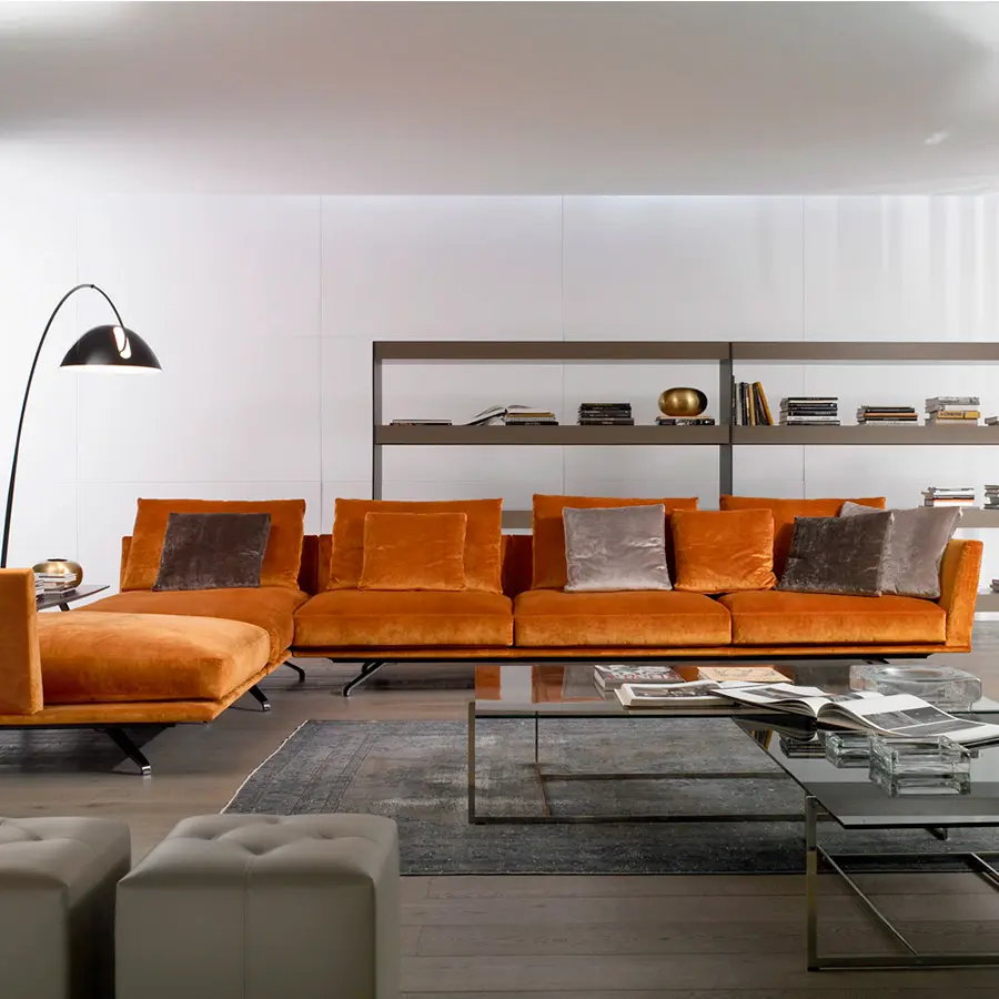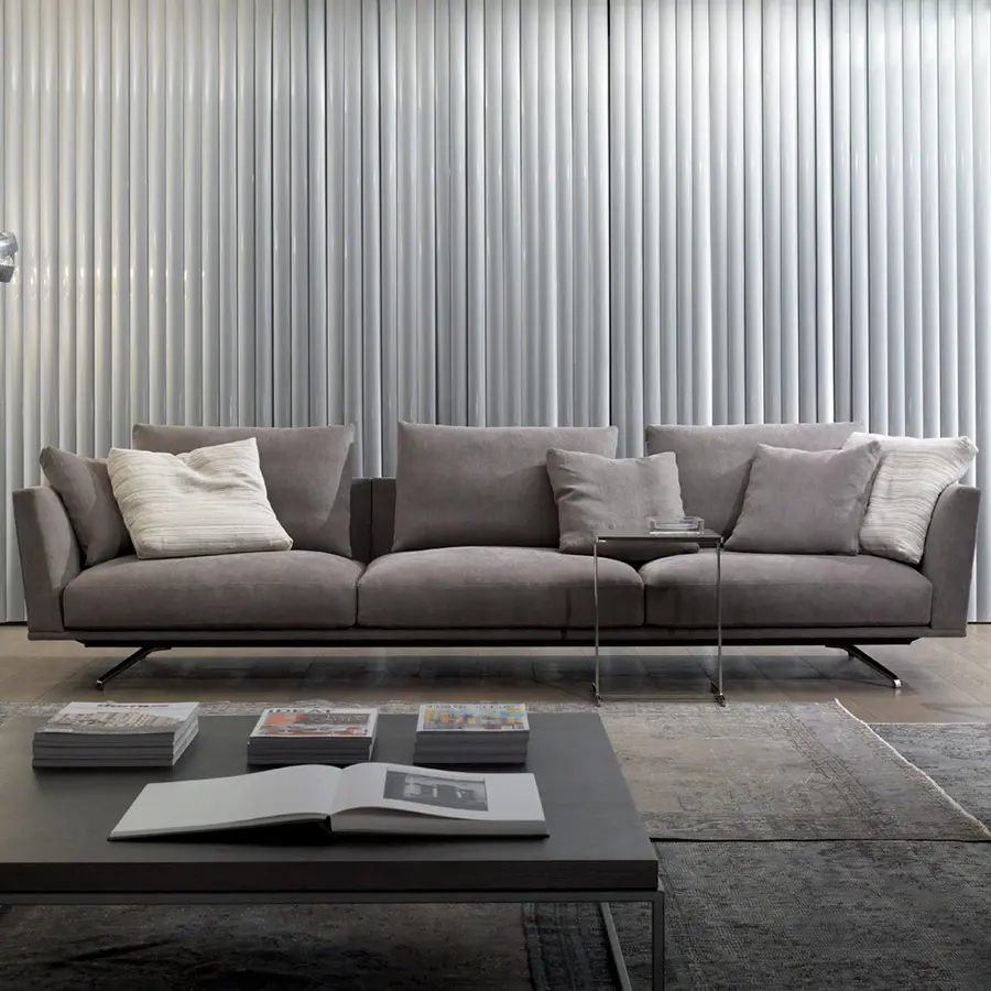 La colección Shelby se concibe como un producto lineal que visiblemente despega del suelo. Todo su volumen se presenta sustentado únicamente por unas finas patas inclinadas en sus dos extremos y su aparente fino bastidor metálico permite la creación de sofás de más tres metros. Debido a los cojines que aporta, es fácil acomodarse en él. El programa permite numerosas combinaciones a fin de poder ser adaptado a múltiples espacios, con ello se pueden conseguir grandes sofás, sofás con chaise-longue o incluso rinconeros. La versión Shelby Class permite la ubicación del mismo producto en ambientes más contemporáneos, gozando de la misma resolución técnica, pero añadiéndole el detalle del volante inferior, que le aporta otro tipo de riqueza al mismo producto.