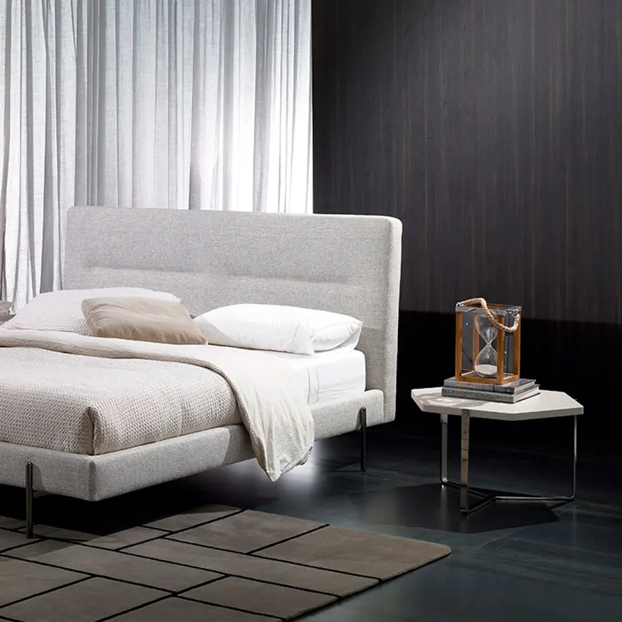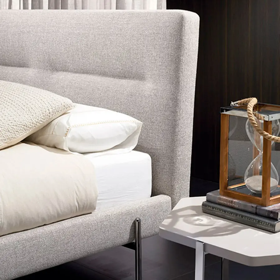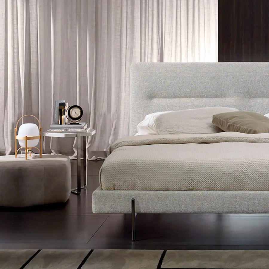 Sidney es ante todo una cama extremadamente ligera, es como si flotara en el aire, como si estuviera suspendida en el mismo. Se apoya en sus finas patas metálicas, y visualmente parece encastada en las mismas. La hendidura confeccionada en el cabezal parte la altura del mismo en dos, confiriéndole a la cama un sello de actualidad. La cama se presenta en todo tipo de medidas para adaptarse cualquier colchón.