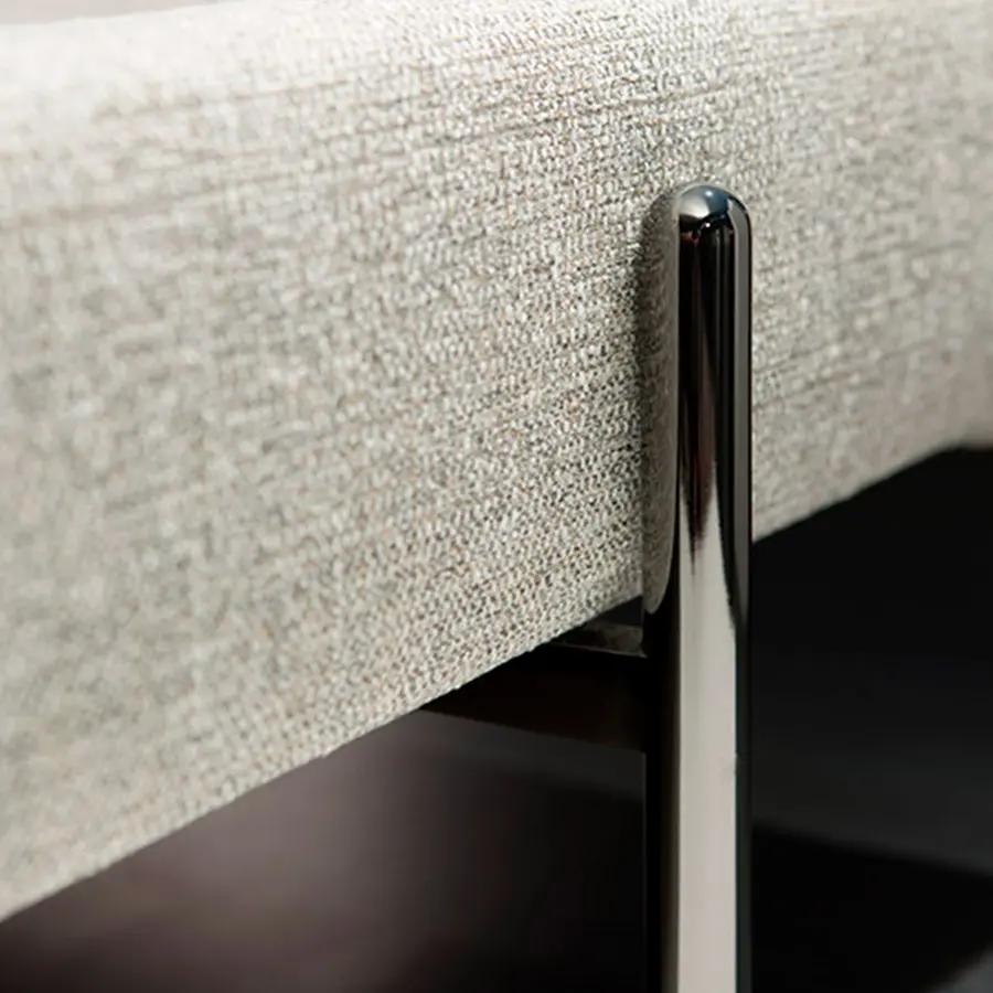 Estructura de madera recubierta de espuma de poliuretano y fibra de poliéster hueca siliconada, forrada con tejido protector. Estructura de hierro pintada en poliéster. Completamente desenfundable y desmontable. Pies en acero acabado según muestrario.