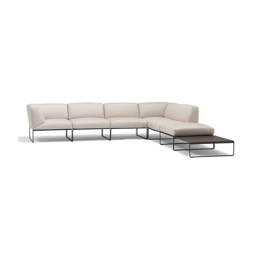 Mesa auxiliar con base de patín de varilla de acero y sobre de chapa de acero con tratamiento EPL-5 para exterior disponible en diferentes acabados.