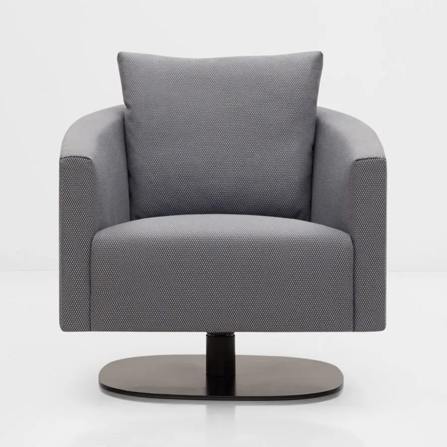 Asiento realizado en distintas densidades de espuma de poliuretano, acolchado en la superficie con fibra. Cojín de respaldo relleno de fibra de poliéster y pluma lavada y esterilizada. Base giratoria metálica con base plana o en cruz en pintura poliéster en polvo acabado manganeso.