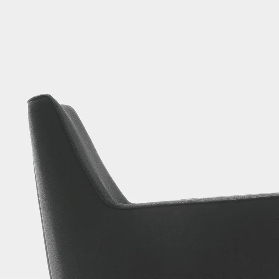 Hat es un diseño de líneas sencillas, realzadas por la costura o vivo que perfila su silueta. Con una suave inclinación, el cuerpo de la butaca constituye una sola pieza sobre la que se incorpora el cojín del asiento. El conjunto se apoya en un pie giratorio metálico o unas patas de tubo cromado. Tapicería totalmente desenfundable. En piel, cojín de asiento desenfundable.