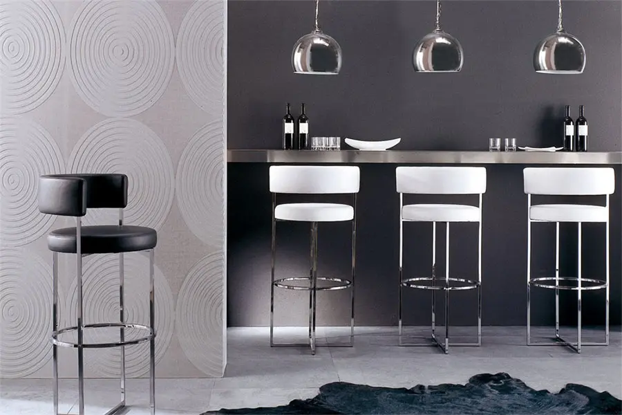 Taburete con estructura en metal y revestimiento en las telas de la colección. Posibilidad de hacerla en silla y en muchos acabados.