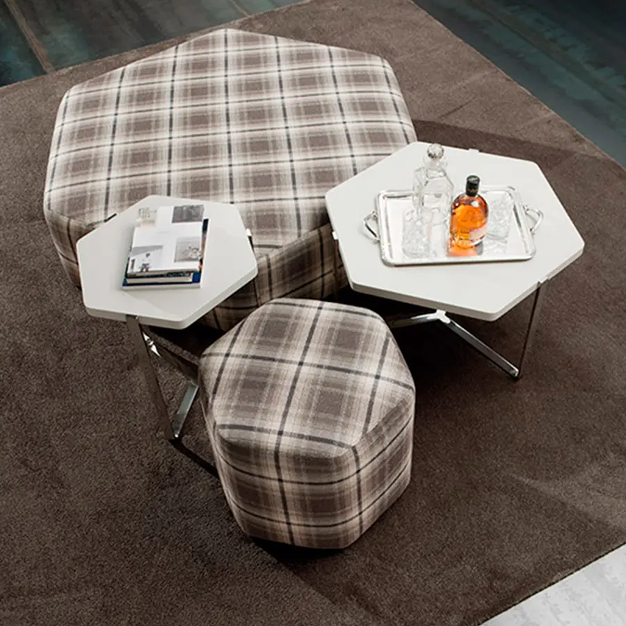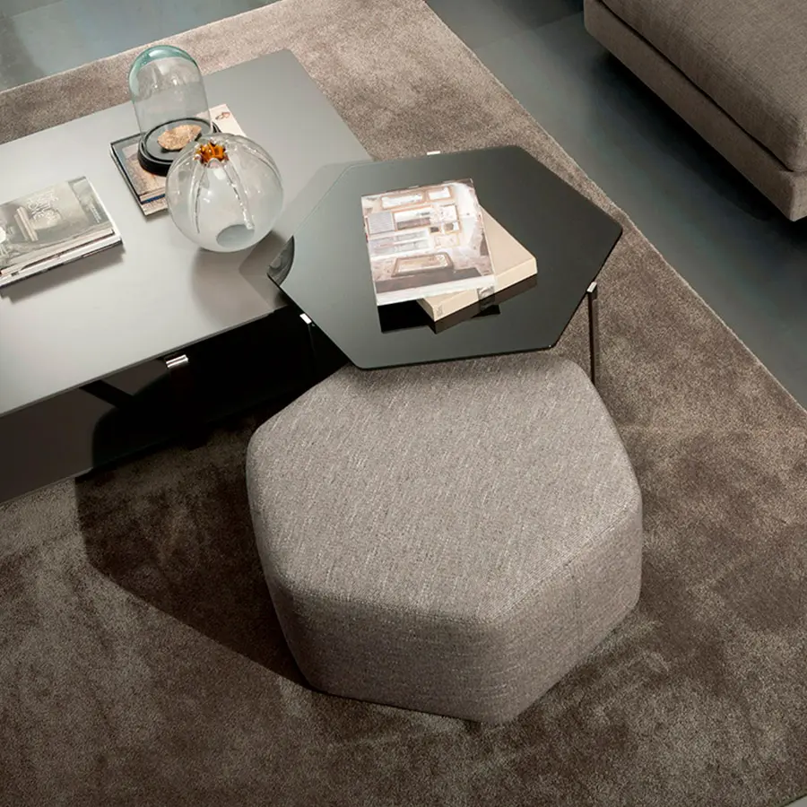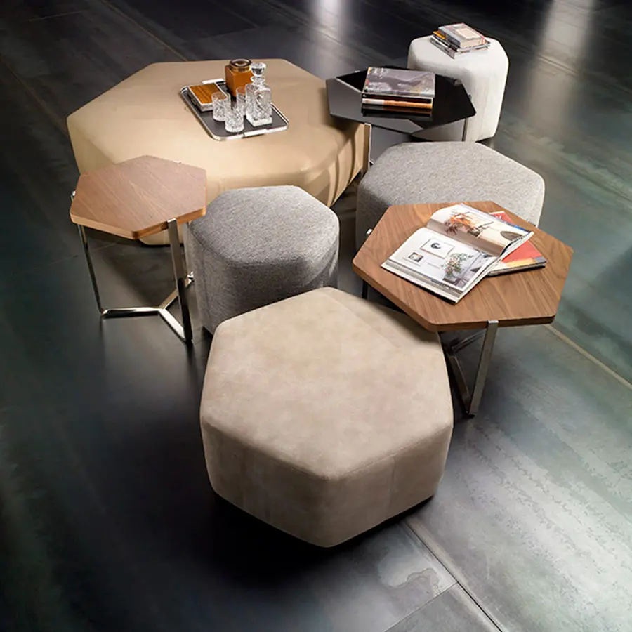 Los pufs Sixties se caracterizan por su forma hexagonal, esta permite que se combinen entre sí con facilidad o que se dispongan individualmente con la suficiente entidad. Se presentan en distintas medidas de ancho y altura, para así crear una zona no uniforme. Su forma permite la total fusión con la colección de mesas Prince para la creación de grandes zonas centrales flexibles. Esta fusión permite agrandar o encoger la zona donde se disponen estos elementos en función de las necesidades y el momento.