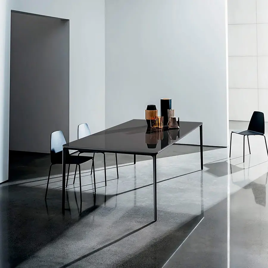 Disponible en múltiples acabados –desde cristal lacado o cerámico hasta madera o HPL–, Slim se adapta con elegancia tanto a comedores modernos como a espacios contract de alto nivel. El diseño de su perfil, sutil y perfectamente estudiado, permite crear mesas de grandes dimensiones sin que pierdan su estética ligera. Ya sea en formato fijo o extensible, la mesa Slim demuestra cómo el diseño italiano puede unir sofisticación y funcionalidad con maestría.