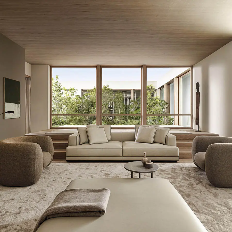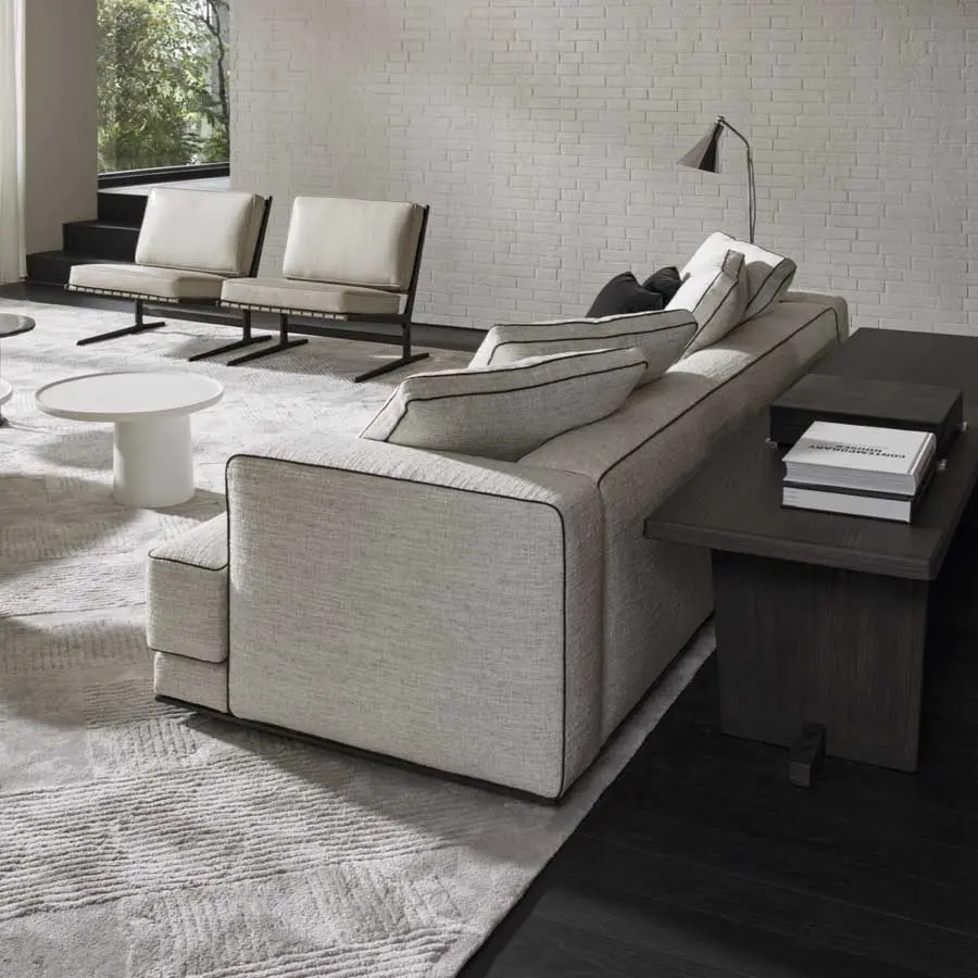Al concebir el sofá Augusto, Van Duysen partió de la idea de un confort total. Examinó cuidadosamente la forma en que el cuerpo se hunde en su asiento voluminoso, se reclina en el respaldo acolchado o simplemente se apoya en sus elegantes reposabrazos cuadrados. Solo una vez que se determinaron estos factores, comenzó a formar la silueta, que incorpora una base metálica que corre alrededor del perímetro del sofá, enfatizando su volumen y haciéndolo parecer super ligero.