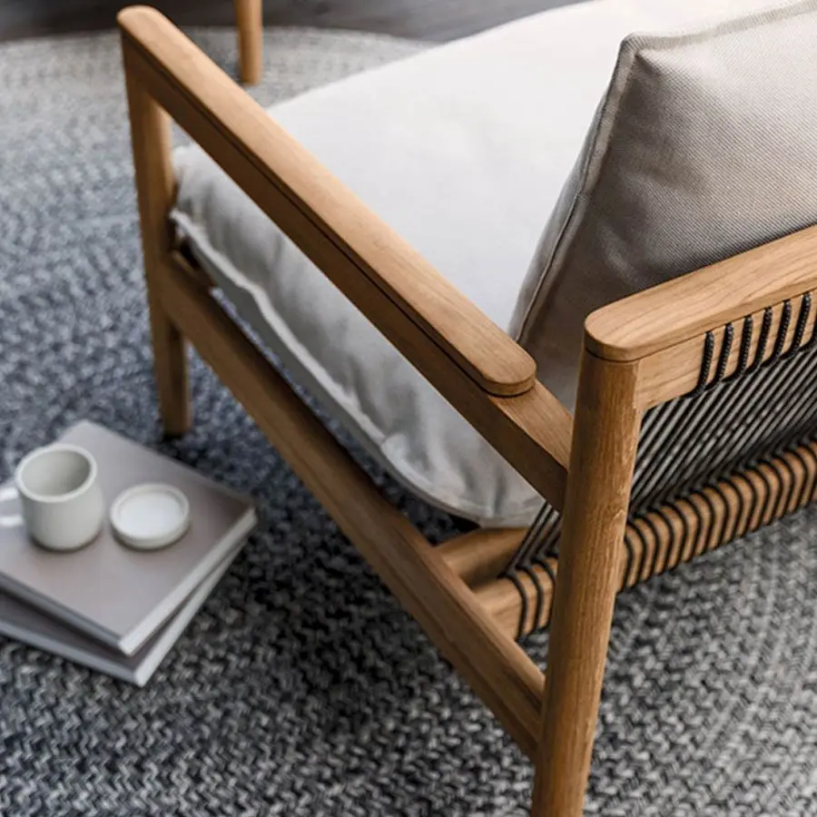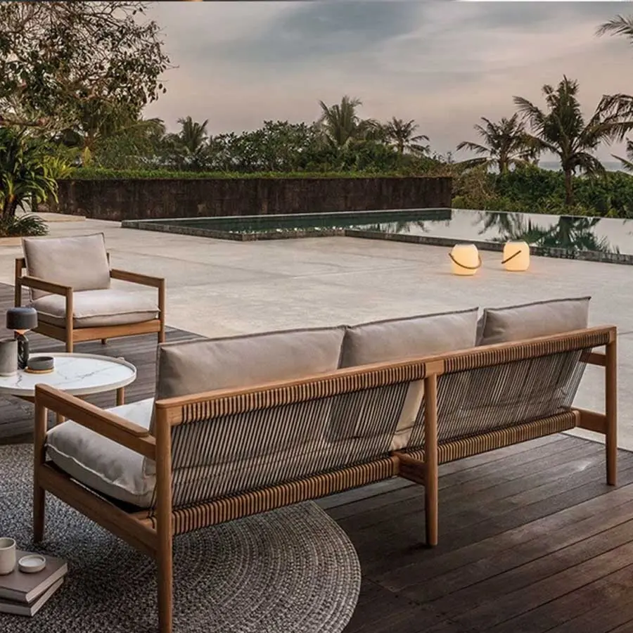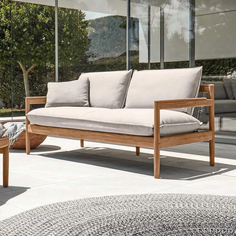 Saranac es un sofá para exteriores con estructura de teca natural, asiento y respaldo de cuerda tejida y cojines tapizados en tela para exteriores. Al diseñar Saranac, Mark Gabbertas imaginó un diseño que combinara un confort excepcional con una estética perdurable. Un enfoque de diseño que sedujera en lugar de gritar, que hiciera que uno se sintiera cómodo de inmediato y que pudiera seguir encantando durante años.