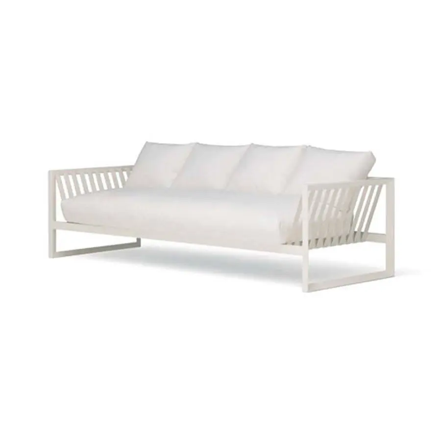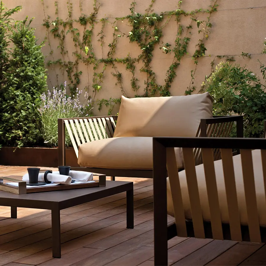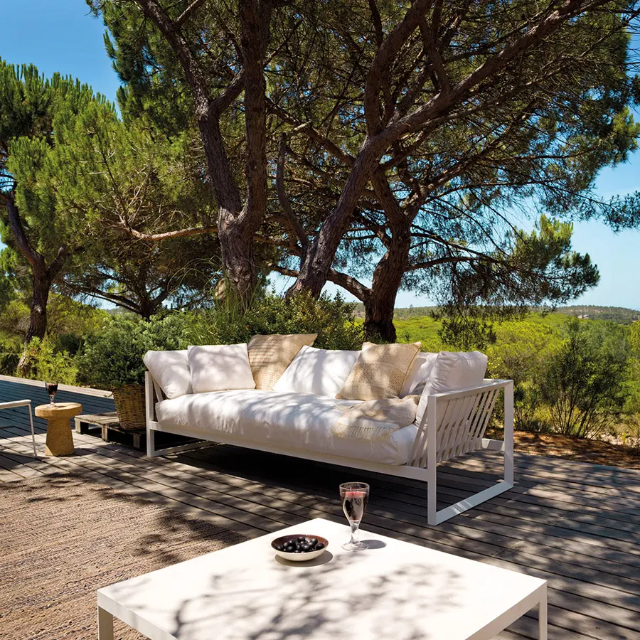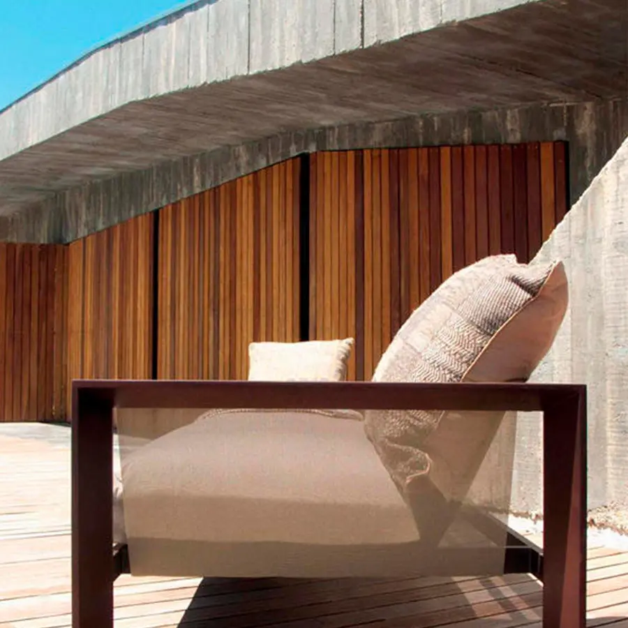 Serie de sofás ligeros y confortables, realizados a partir de una estructura de madera Ecolignus®. Los asientos y respaldos se apoyan en cintas o Batyline®, opcionalmente. Se pueden lograr combinaciones más clásicas o informales mediante distintas combinaciones de cojines. Las cintas están disponibles en Marrón Tierra, Arena, Grafito blanco y el Bayline® se ofrece en Marrón Tierra, Arena, Negro y Blanco y pueden combinarse con todas las telas de nuestro catálogo.