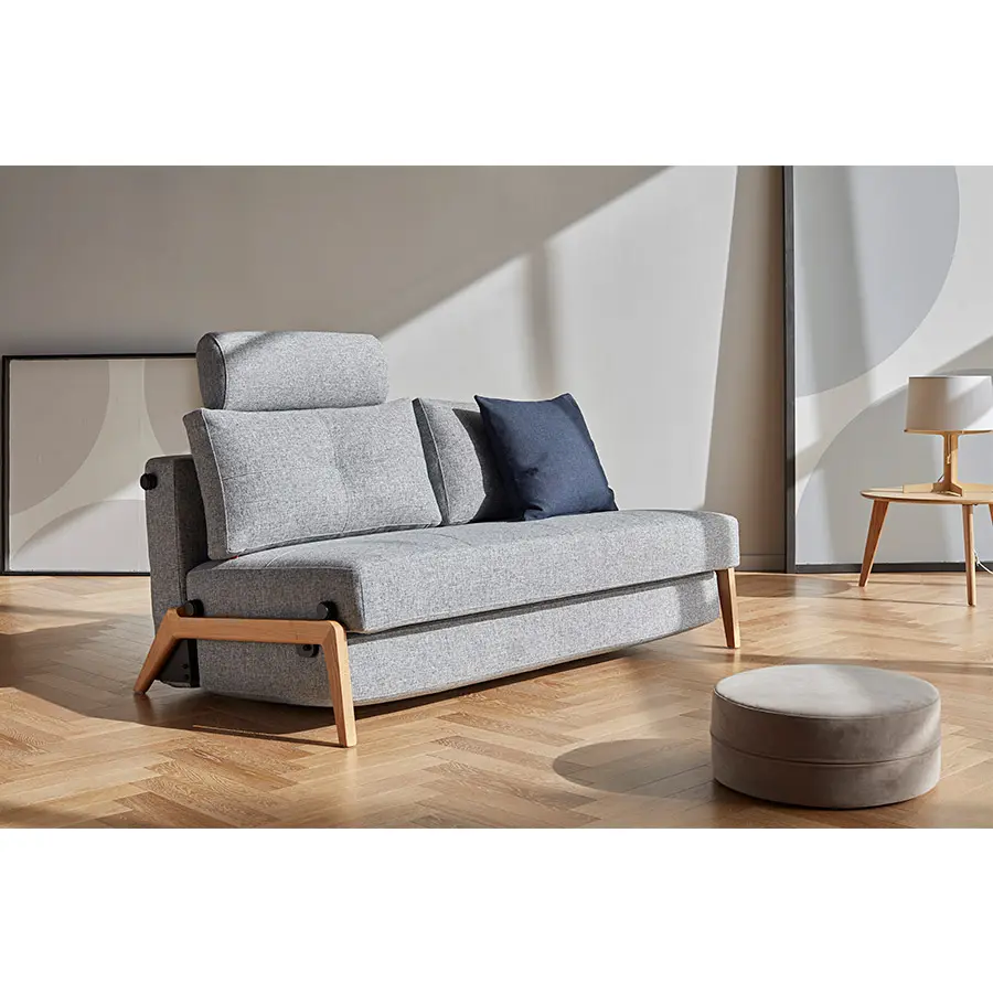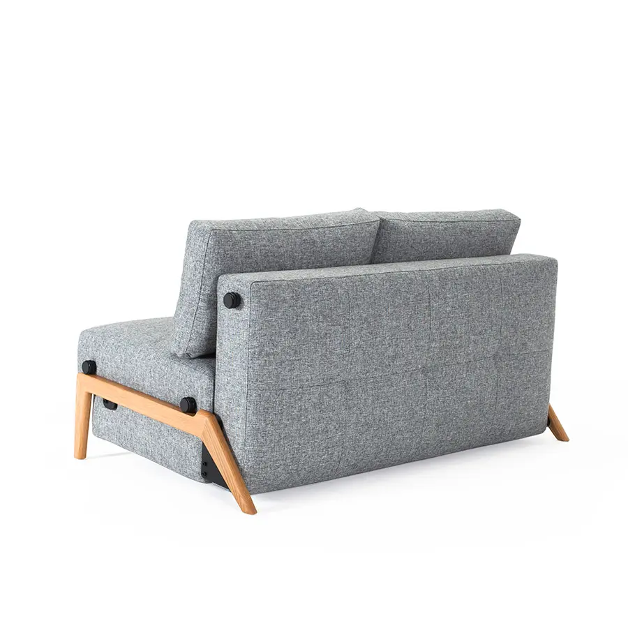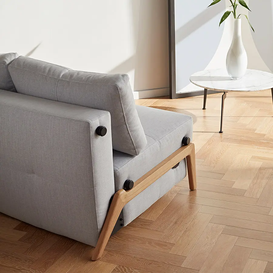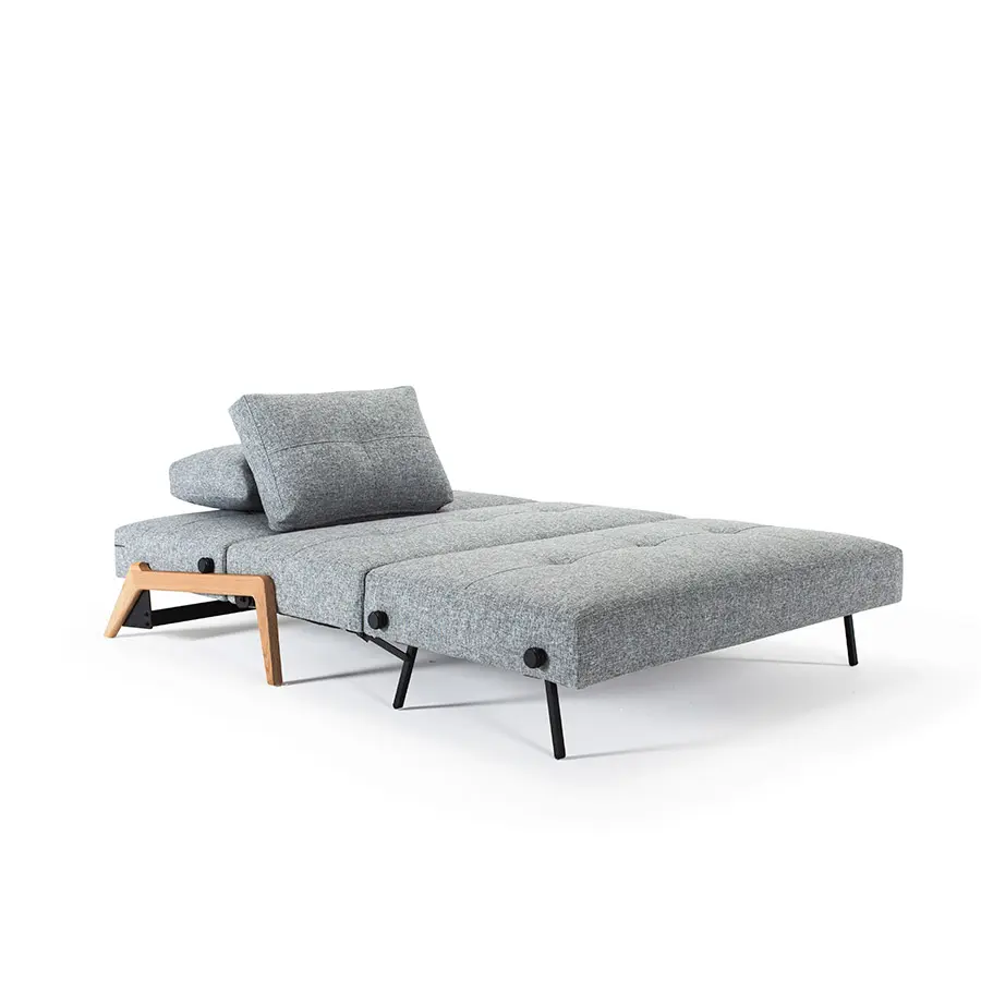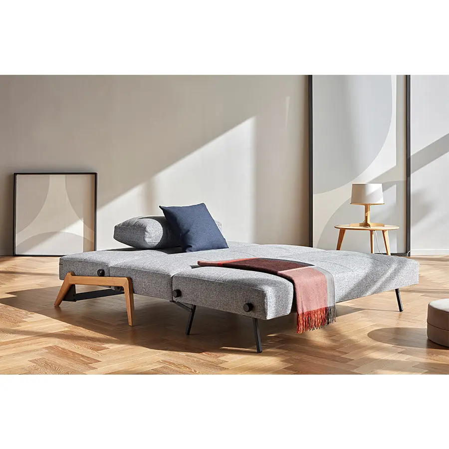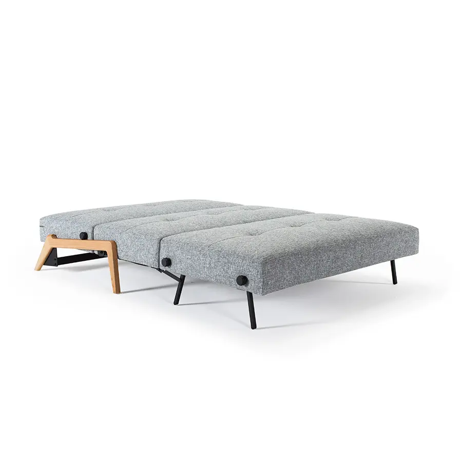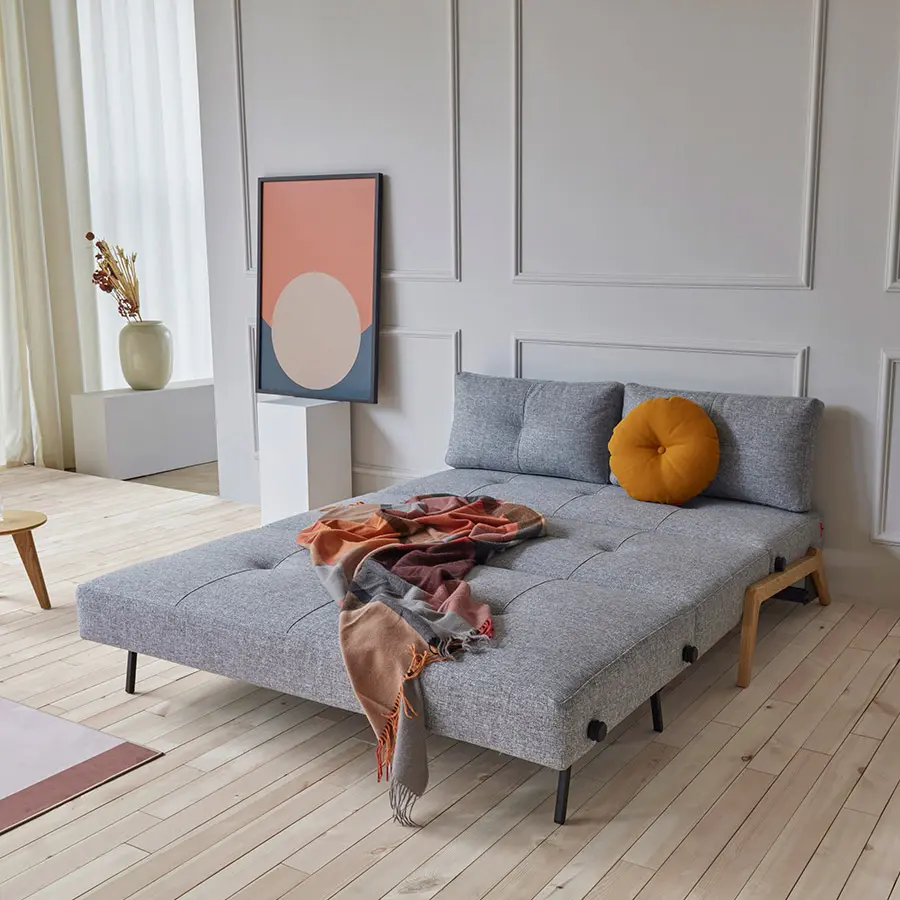 Cubed es un sofá cama compacto que se adapta a diversas situaciones y habitaciones. Cubed puede tener la estructura metálica o de madera. Pero su característica principal es que gracias a sus pequeñas dimensiones es un sofá cama que ahorra espacio y se adapta a los desafíos de la vida urbana actual. Al convertir el sofá en una cama, las patas se pliegan automáticamente y el sofá se transforma en segundos. Tiene una pequeña caja de ropa de cama en el asiento.