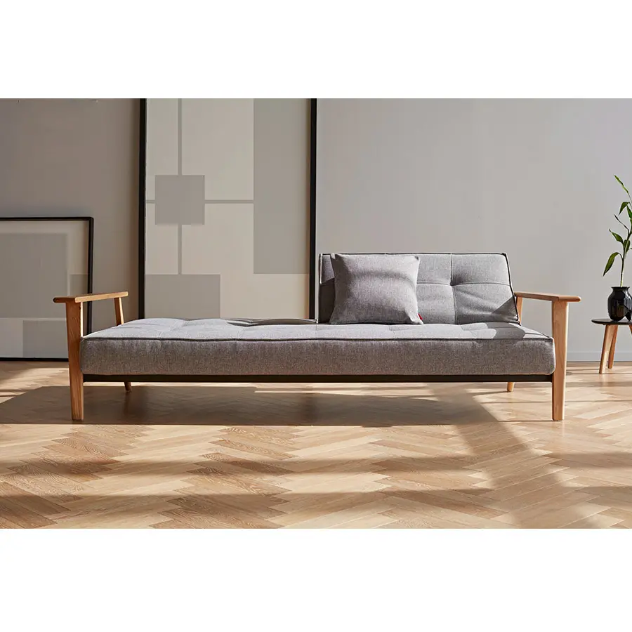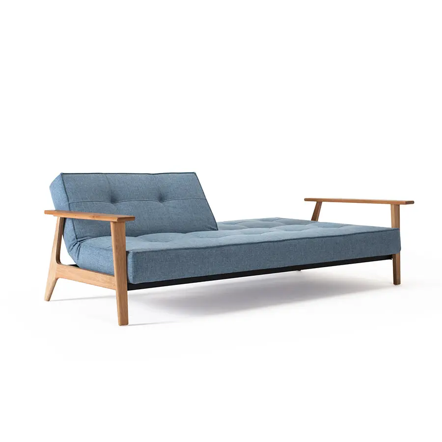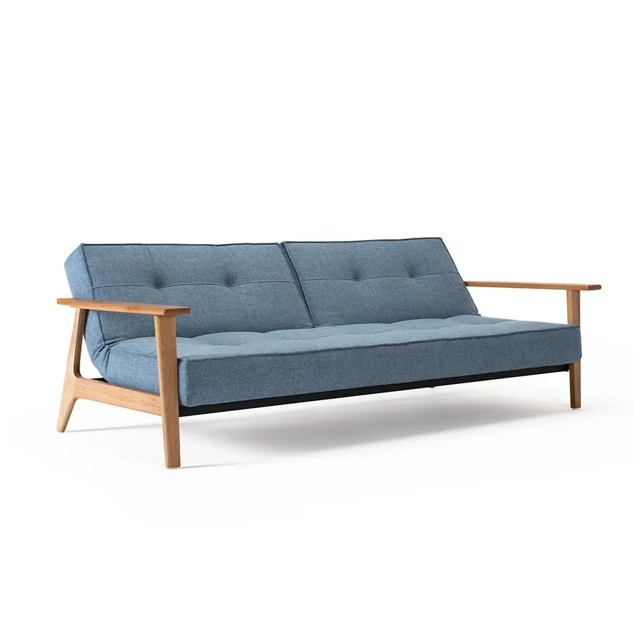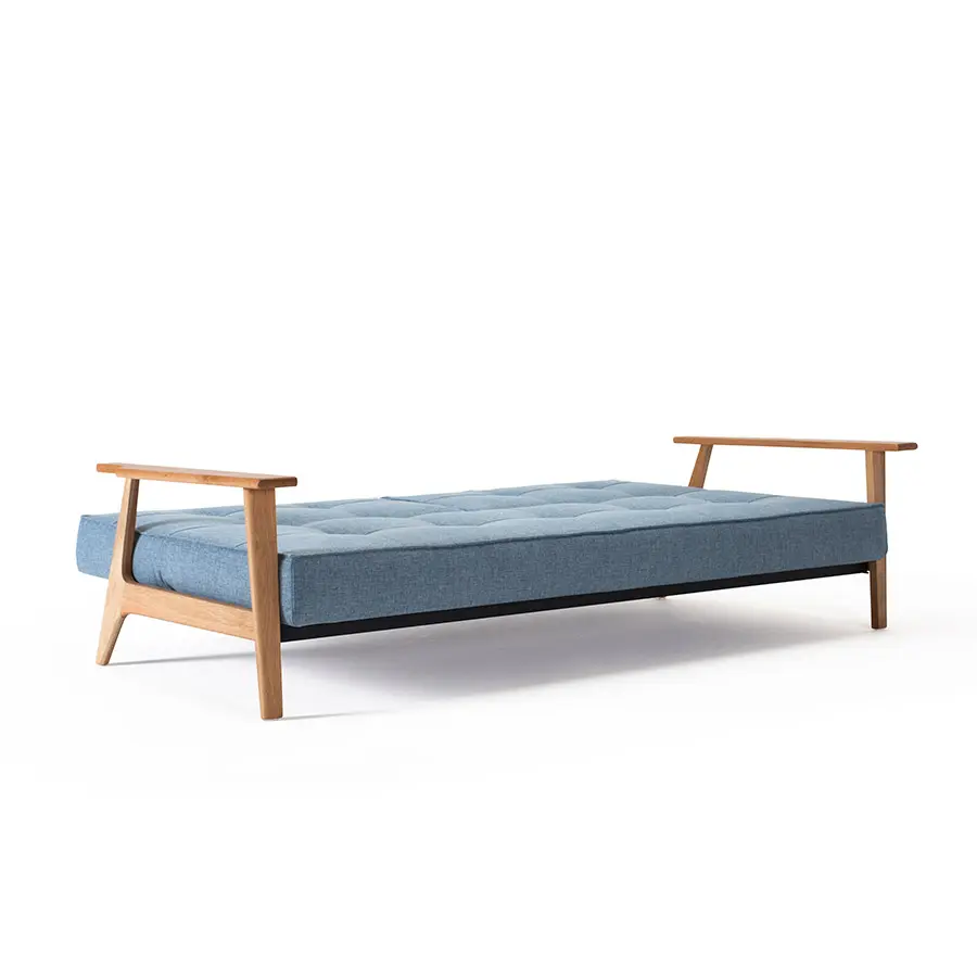 Su estructura es ligera pero resistente, con una base metálica robusta y elegantes patas en madera maciza de roble, que aportan calidez y sofisticación. El colchón con muelles ensacados garantiza un confort superior, tanto en posición de sofá como de cama, y su diseño compacto lo hace perfecto para espacios reducidos que no quieren renunciar al estilo.