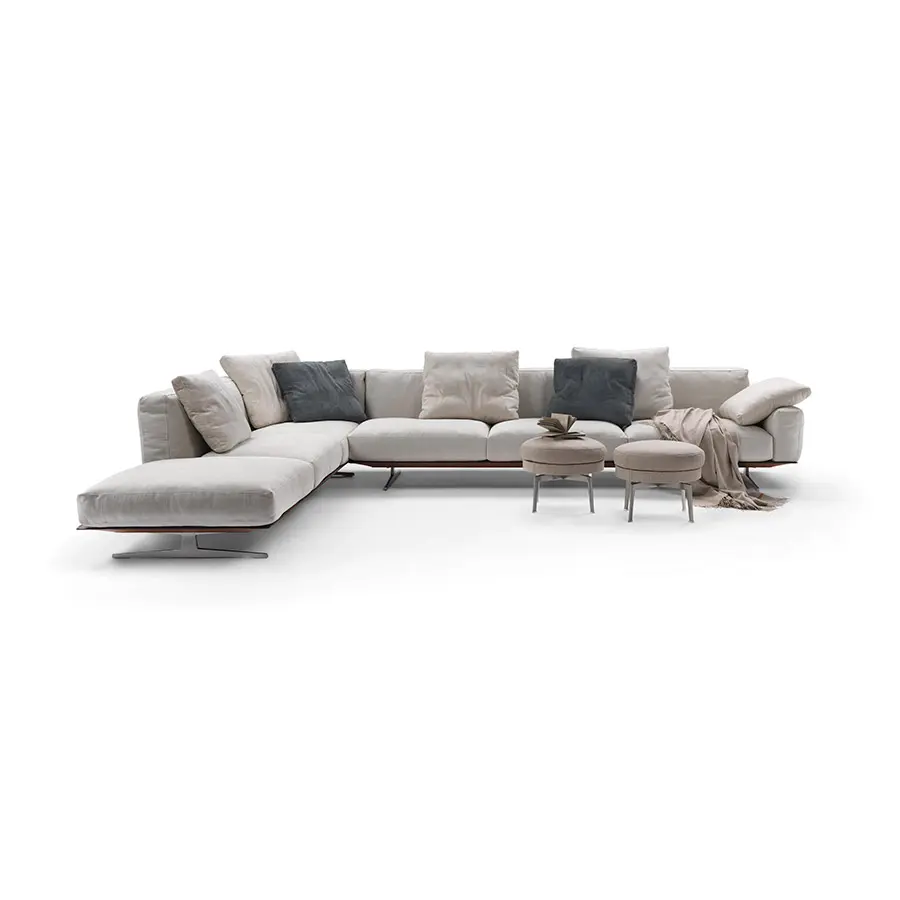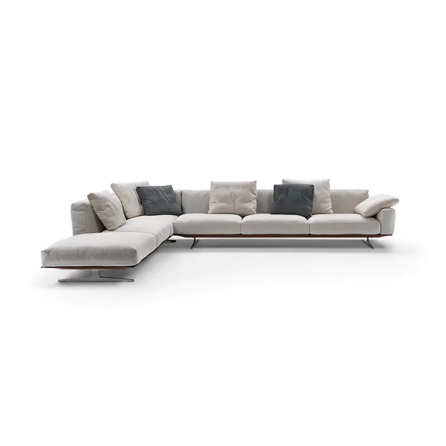 Medirse con el deseo de diseñar un sofá que favorezca la dimensión del sueño. Un desafío afrontado con determinación que ha dado a la luz el concepto del sofá Soft Dream, que ya en el nombre anuncia sus prerrogativas. Versátil, flexible, camaleónica: esta es la personalidad del sistema de asientos Soft Dream. El sofá, ligero, se eleva del suelo gracias a unos refinados pies de metal fundido a presión pintados en los colores gris y bronce, también disponibles en los acabados satinado, cromado, bruñido, champán y cromado negro.