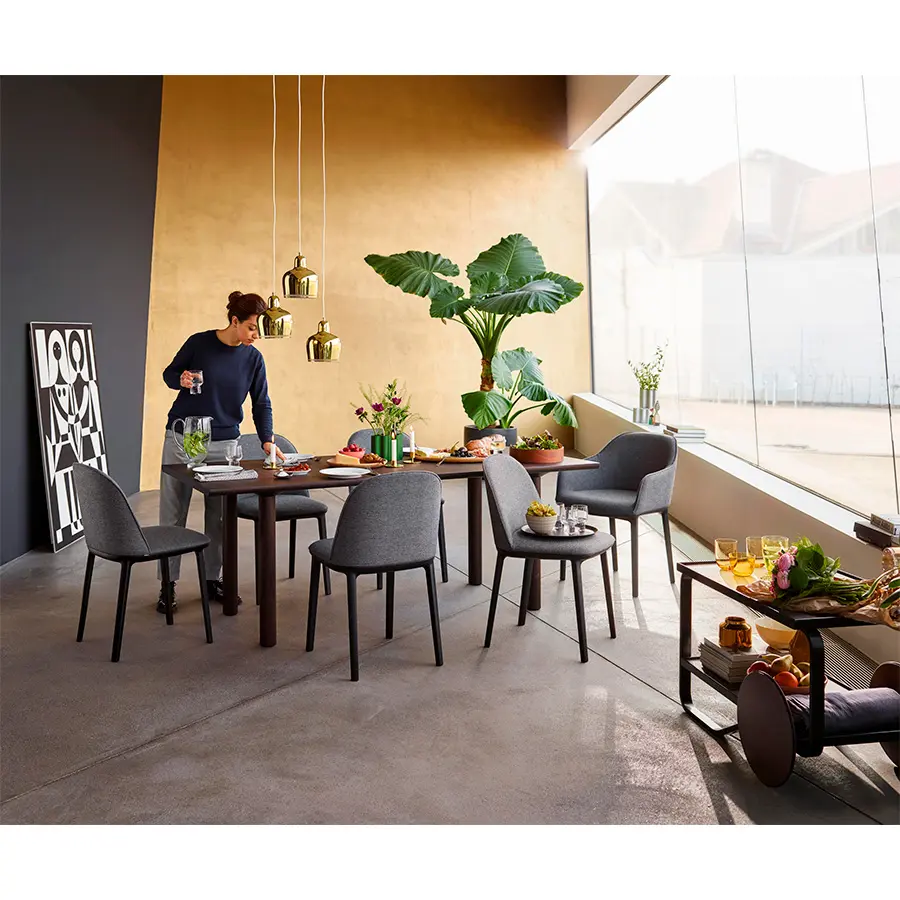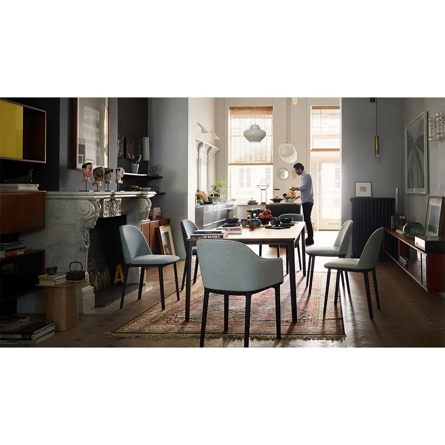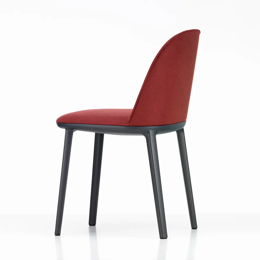 La Softshell Side Chair, cuyos suaves contornos están definidos por un agradable acolchado, tiene un asiento extraordinariamente cómodo y un tamaño compacto: las varillas verticales ocultas en la parte superior del respaldo ofrecen flexibilidad y una notable libertad de movimientos, así como un extraordinario confort incluso cuando se está mucho tiempo sentado. La Softshell Side Chair cuenta con una base de cuatro patas de plástico resistente que acentúa la discreta elegancia de su diseño. Gracias a su gran parecido, la Softshell Side Chair y la Softshell Chair pueden combinarse perfectamente en la misma mesa. Ambas sillas están disponibles en las mismas tapicerías de tela o cuero y en una amplia gama de colores.