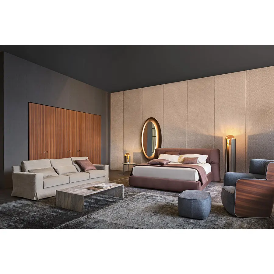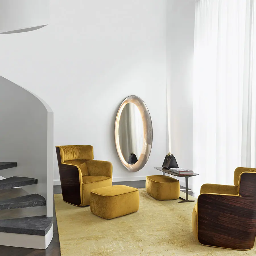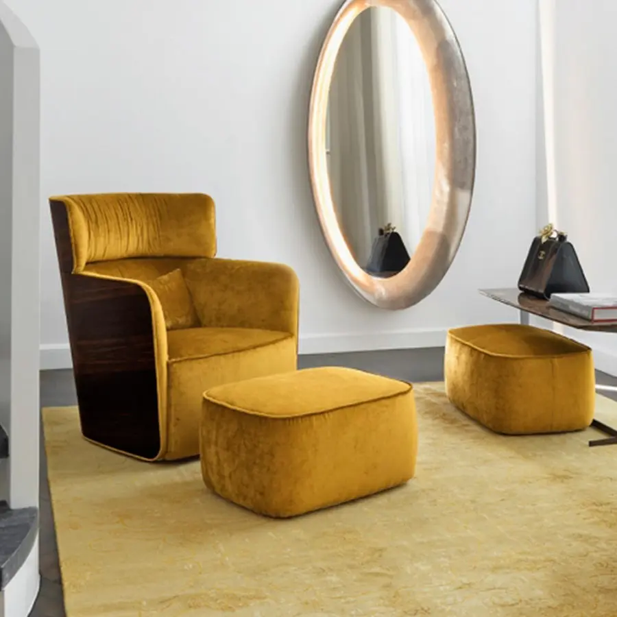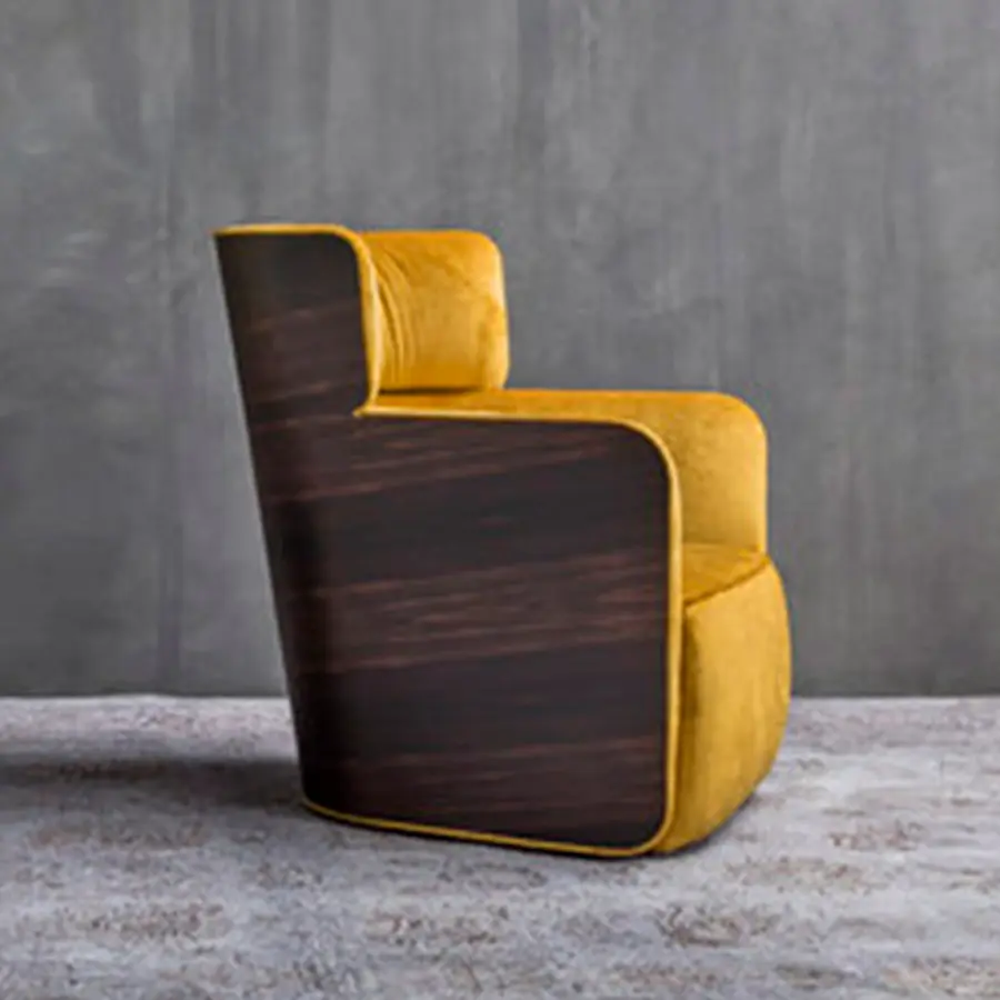Sillón con estructura externa de multicapa de haya curvada, disponible con acabado ébano mate. Asiento y respaldo en Baydur® y poliuretano flexible, con revestimientos fijos en tejido, Ecopelle Dollaro o piel.