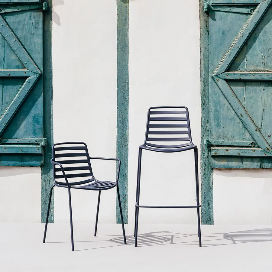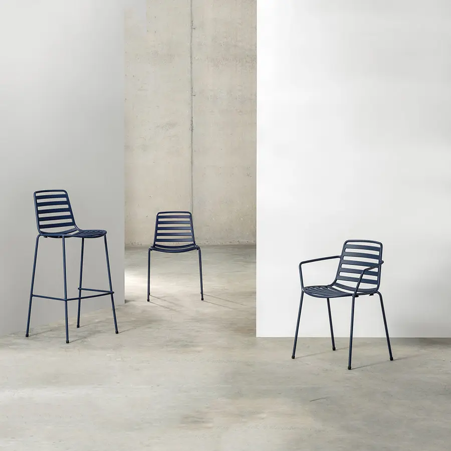 Las sillas de calle y los taburetes son un primer paso en nuestra expansión hacia muebles de exterior. Las técnicas utilizadas para dar forma a la tubería de acero proporcionan sostenibilidad para la familia, adaptándose a cualquier situación climática.