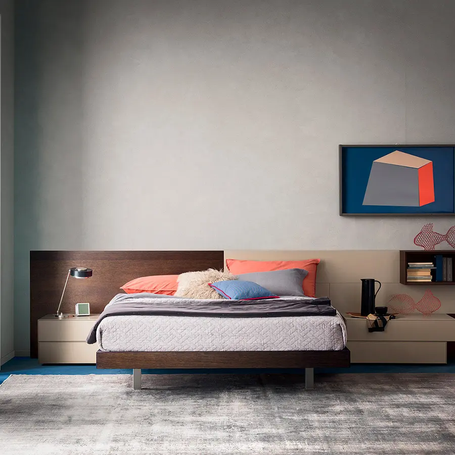 No solo una cama, sino un auténtico sistema componible que brinda amplias posibilidades de configuración y combinación de acabados. Hay cinco plataformas disponibles en combinación con los paneles tapizados y con las boiseries equipadas con cómodos estantes de metal. Disponible en una amplia selección de medidas, incluso con contenedor.