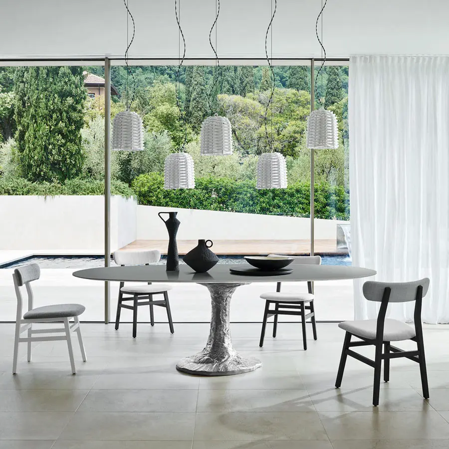El trabajo artesanal de antigua tradición se combina con materiales contemporáneos en la familia de lámparas colgantes Sweet 91/95/96. Realizadas con entramado de PVC negro mate o blanco brillante, están disponibles en varias variantes, con forma de campana o con la clásica forma de cúpula, en tres tamaños diferentes.