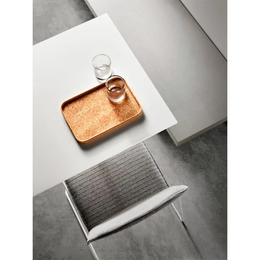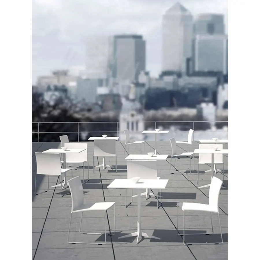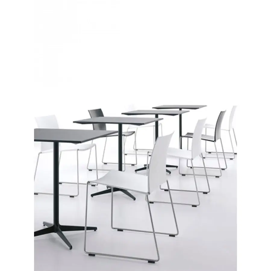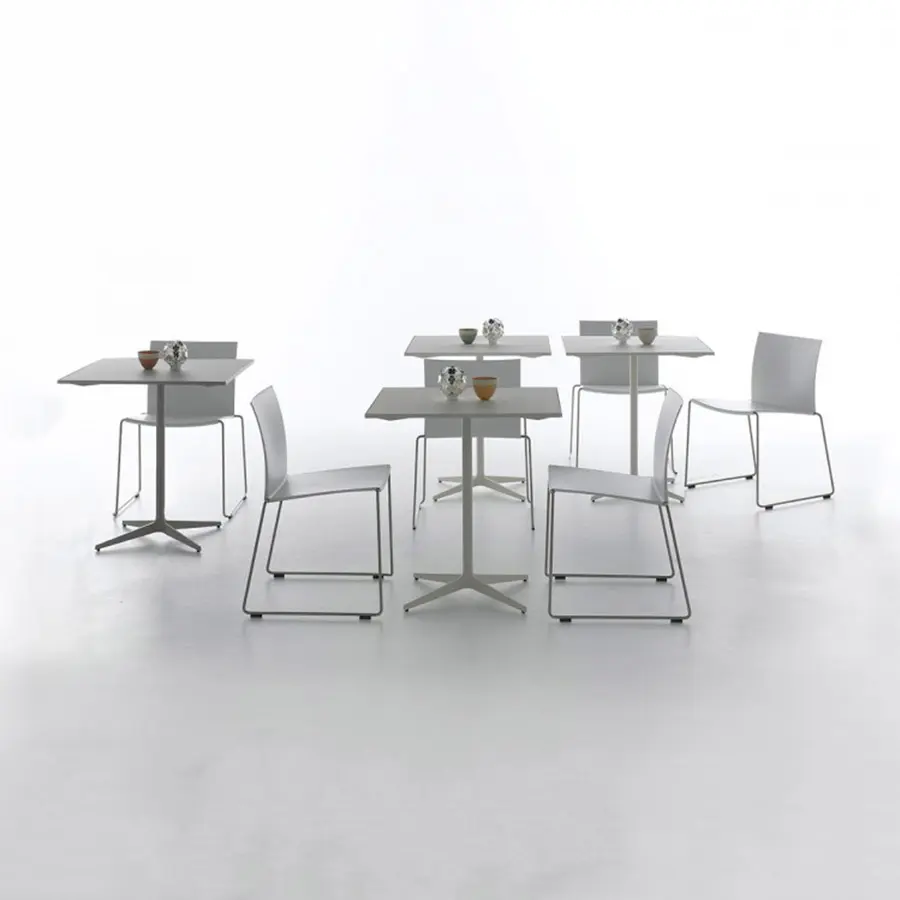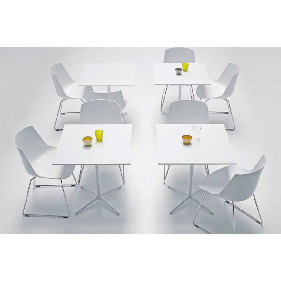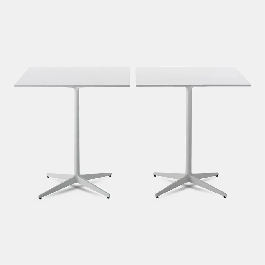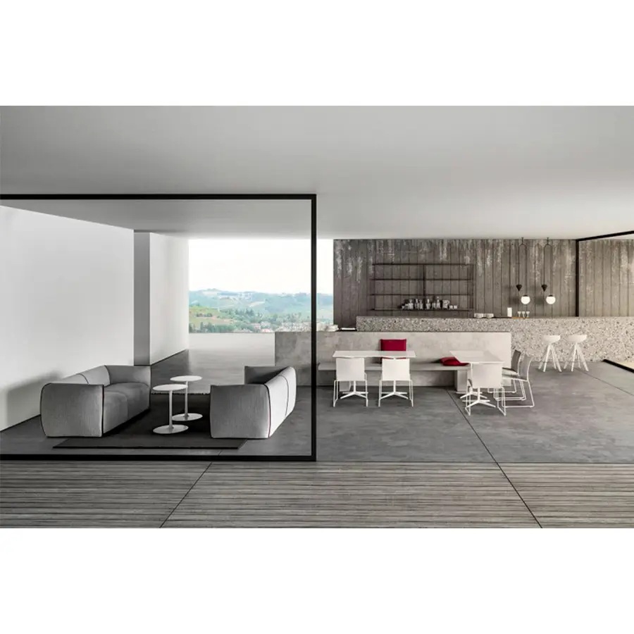 Una mesa de café con una pata central caracterizada por la continuidad cromática de la parte superior y el marco. Marco: con una pata central de acero y una base de estrella de 4 puntos de aluminio fundido pintado en blanco mate o gris grafito.
