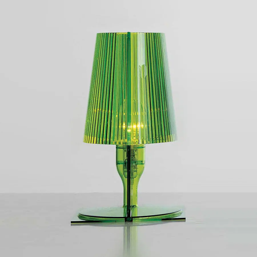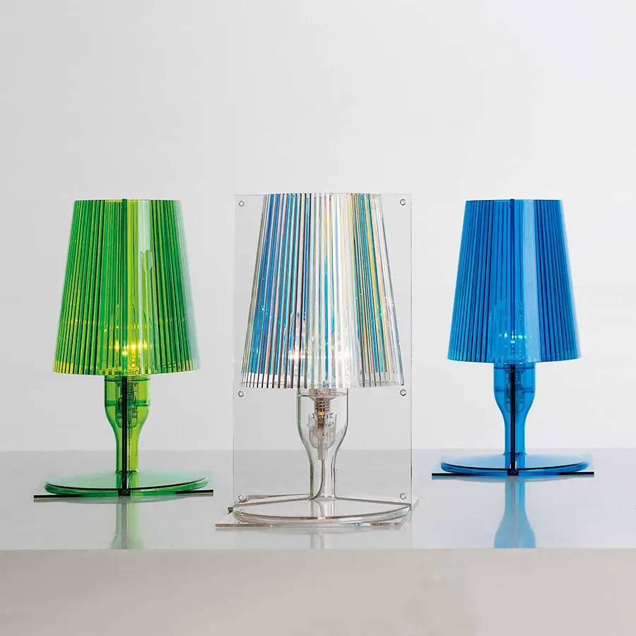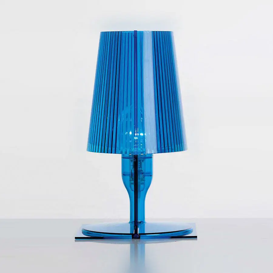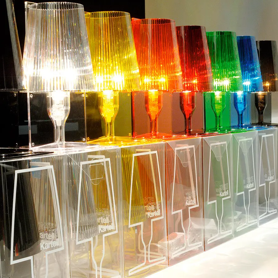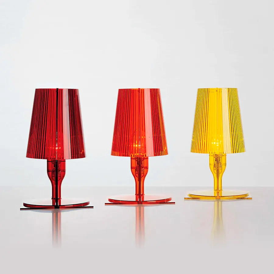 La imagen clásica de la lámpara de cabecera ha sido revisada por la tecnología Kartell y transformada en un producto industrial. Hecho de policarbonato inyectado transparente o coloreado, Take está disponible en varios tonos cromáticos. La forma proviene de la unión de dos partes simétricas unidas: dos placas planas, rectangulares y bidimensionales, cada una de las cuales asume la forma y el volumen de una media lámpara. El pliegue interno de la pantalla de la lámpara embellece el artículo, creando un juego de luces cuando se enciende. La óptima relación calidad-precio y el embalaje perfecto para un producto de efectivo y transporte lo convierten en una excelente idea de regalo.