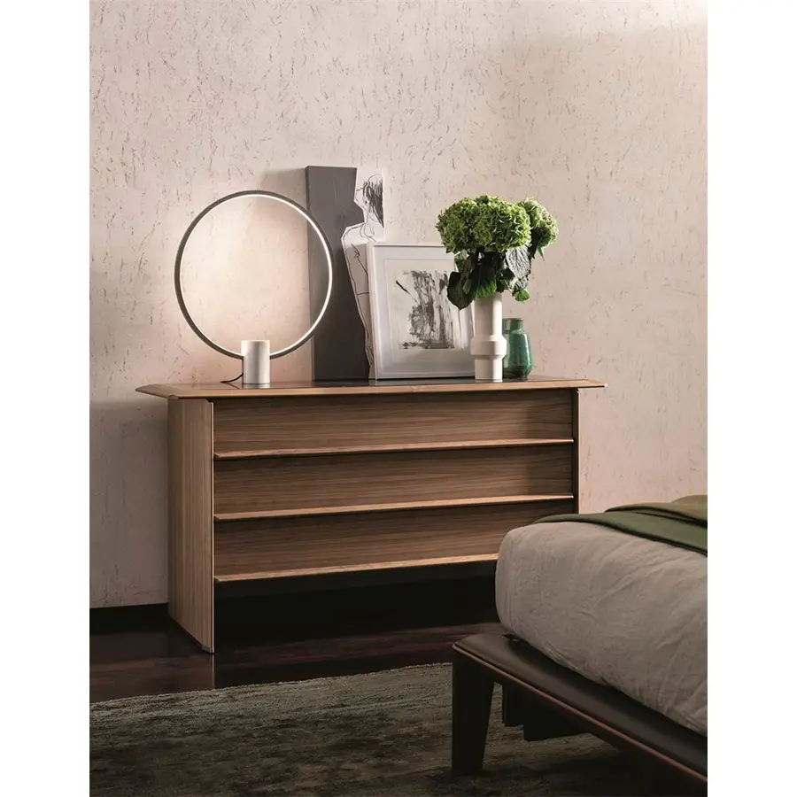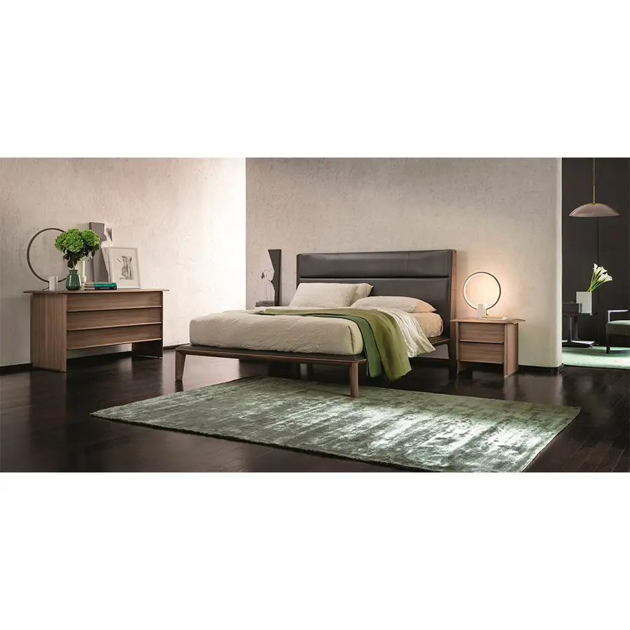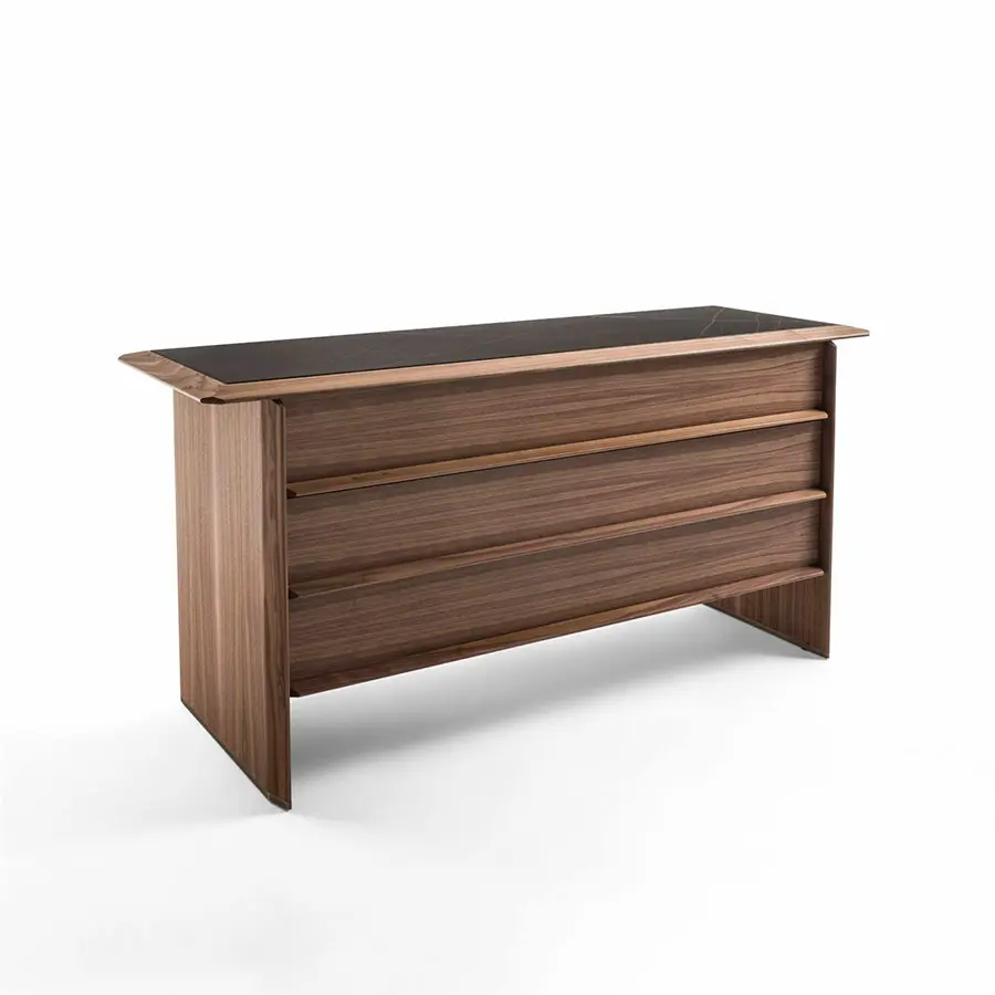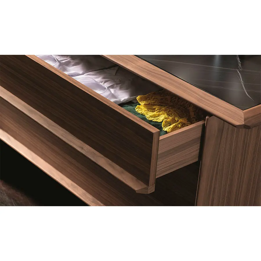 Mesa de noche de dos cajones con bordes de madera maciza y tapa de madera, de mármol o de Rock. Laterales con pies en latón bronceado cepillado.