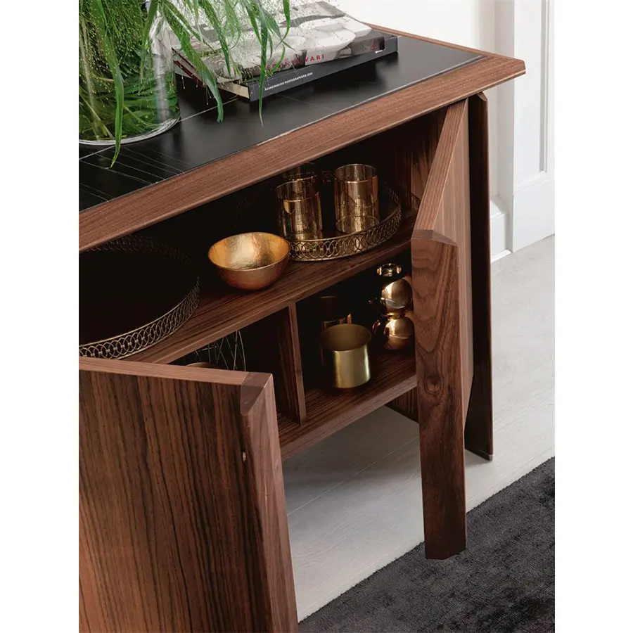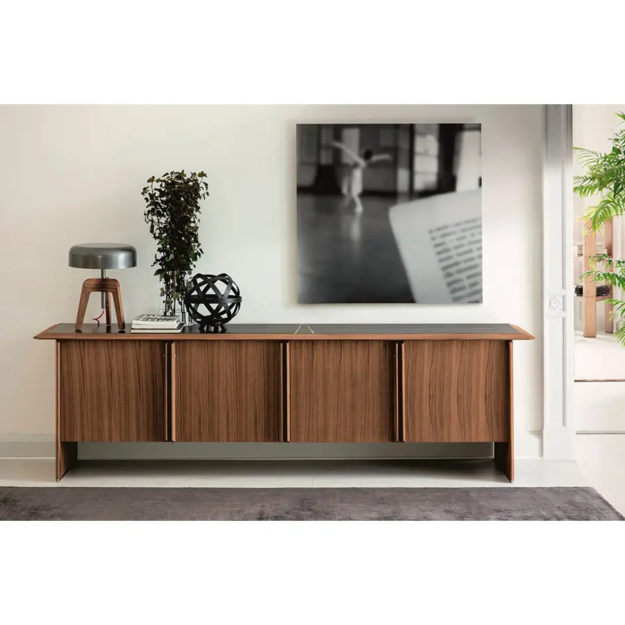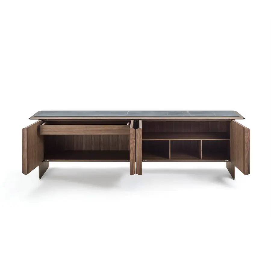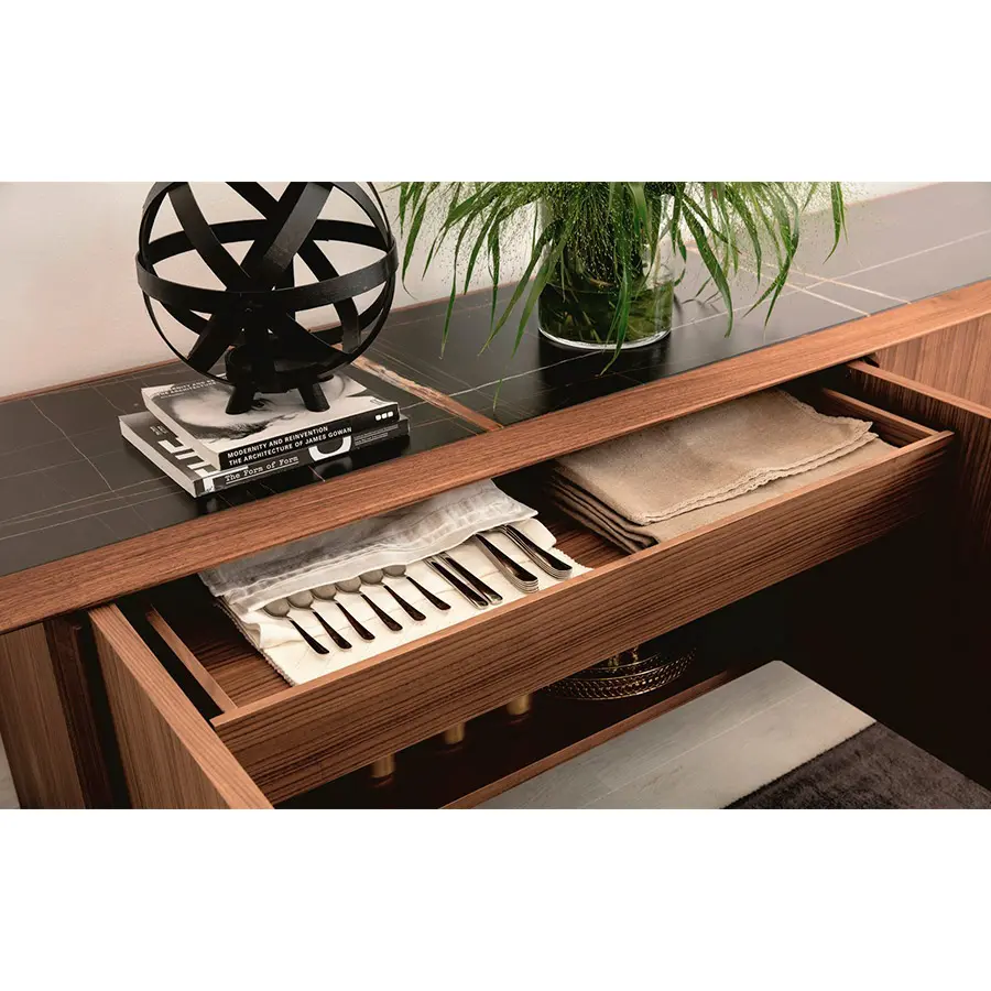 Aparador en nogal canaletta con tapa de mármol o en Rock. Bordes en nogal canaletta macizo. Dotada de cuatro puertas con bisagras y dos compartimentos. En el compartimento de izquierda hay un cajón debajo de la tapa, mientras que el de derecha está dividido en un compartimento superior y tres compartimentos inferiores. Laterales con pies en latón bronceado cepillado. 264x56x75