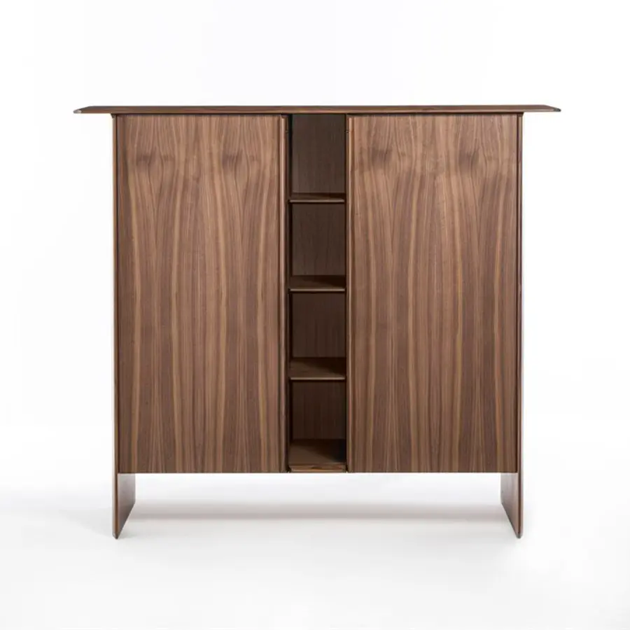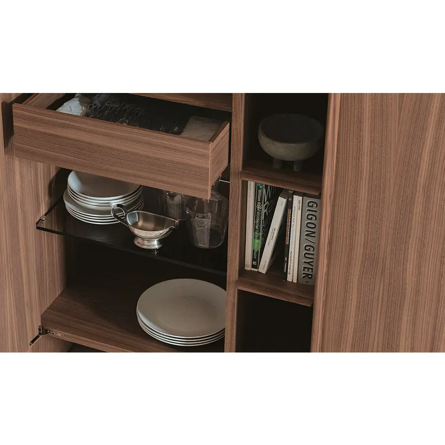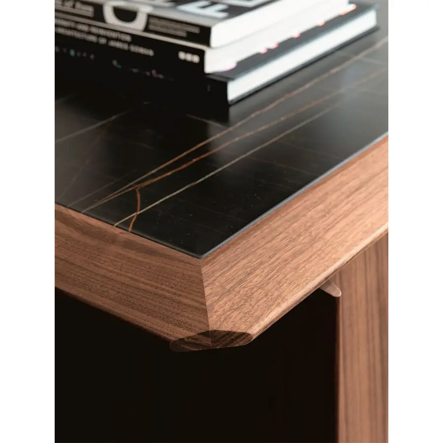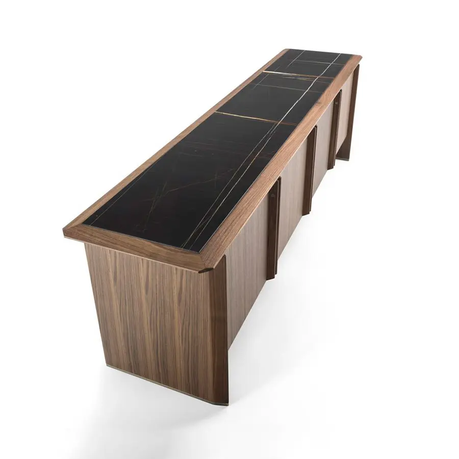Aparador en nogal canaletta con tapa de mármol o en Rock. Bordes en nogal canaletta macizo. Dotada de cuatro puertas con bisagras y dos compartimentos. En el compartimento de izquierda hay un cajón debajo de la tapa, mientras que el de derecha está dividido en un compartimento superior y tres compartimentos inferiores. Laterales con pies en latón bronceado cepillado. 264x56x75