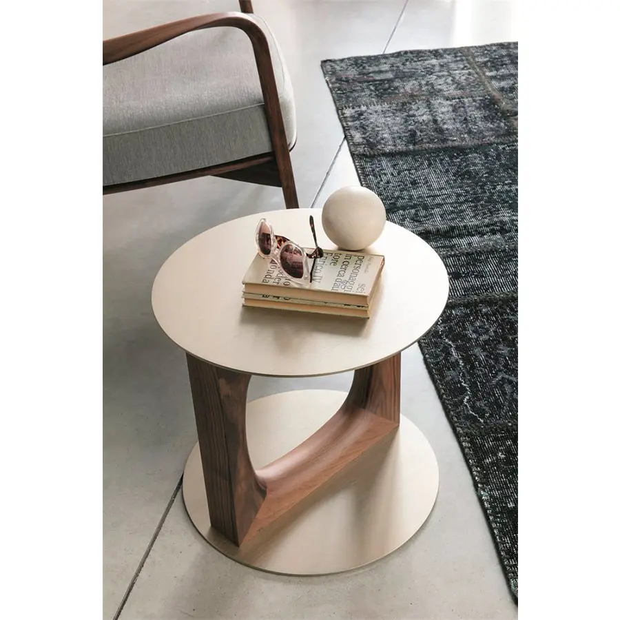 Mesa auxiliar con soporte central de nogal canaletta macizo y tapa y base en metal en acabado latón cepillado. Diametro 45x41H