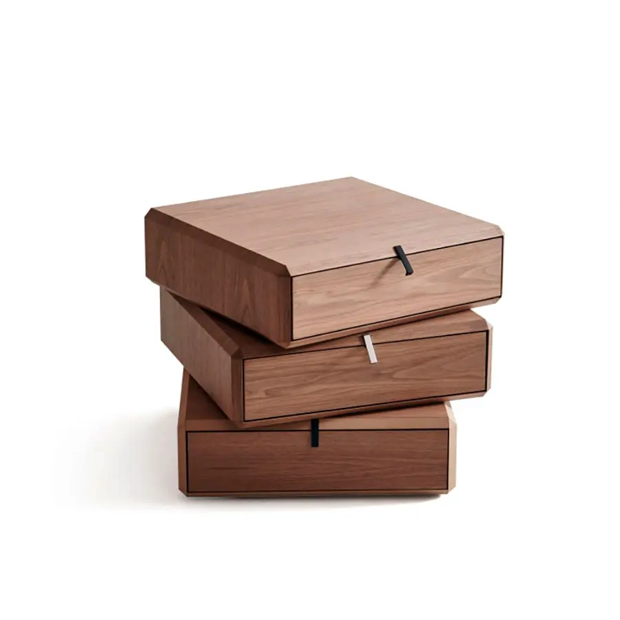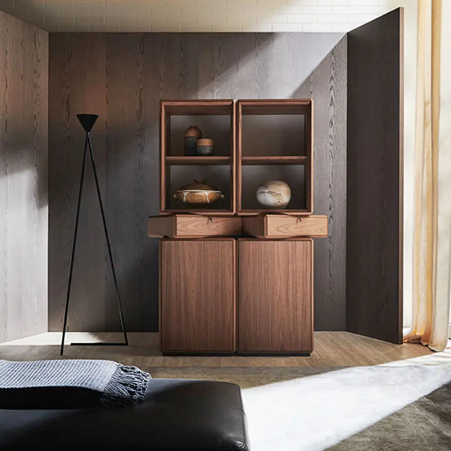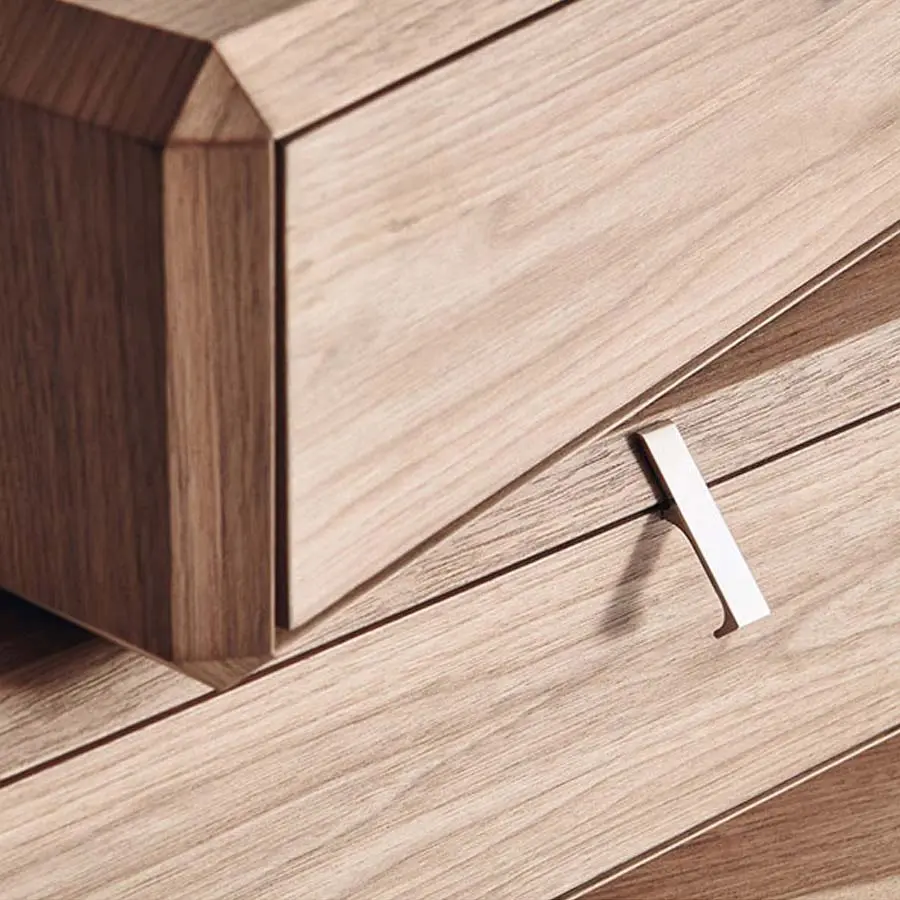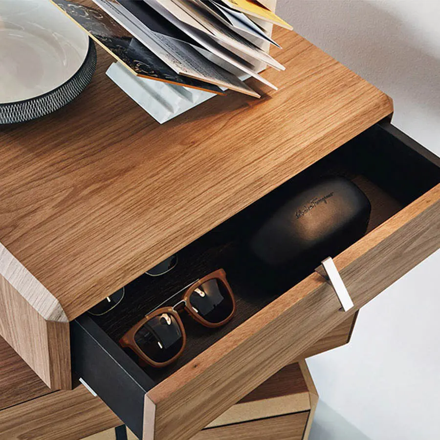 Ron Gilad transforma la cajonera – caracterizada por elementos colocados de una manera desalineada con respecto el eje central – en un mueble contenedor donde la contención y la partes abiertas acristaladas se solapan plasmando un sólido único de superficie multifacética. Los cajones pueden colocarse alineados o inusualmente desalineados con respecto al resto del mueble. La realización, siempre en Nogal Americano o Eucalipto, es la unión perfecta entre la precisión micrométrica de la elaboración mecánica y la maestría artesanal en el plegado y el encolado de los elementos estructurales. Serie de contenedores abiertos o con cajón en nogal americano. Elemento individual o compuesto solapando elementos diferentes para plasmar mesillas, cajoneras, composiciones para la zona salón lineales o irregulares, o en cuanto caja de apoyo sobre la base de mármol de las mesitas 45°.