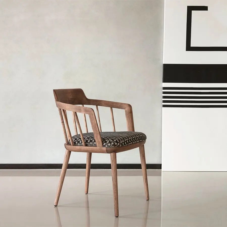 Silla con brazos con estructura de nogal canaletta macizo y asiento revestido en las telas de la colección.