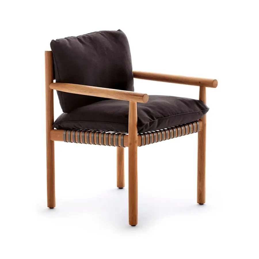 Las sillas TIBBO se distinguen por sus brazos y patas redondos, así como por la curva tridimensional de estilo marinero de su respaldo fino y moldeado. «La belleza de la madera torneada tiene una calidad táctil imposible de encontrar en otros materiales», explican los diseñadores. «Debido a la naturaleza aceitosa de la teca, la madera ofrece una sensación particularmente suave, y eso es lo que nos llevó a realizar unos muebles que acentuaran esas propiedades».