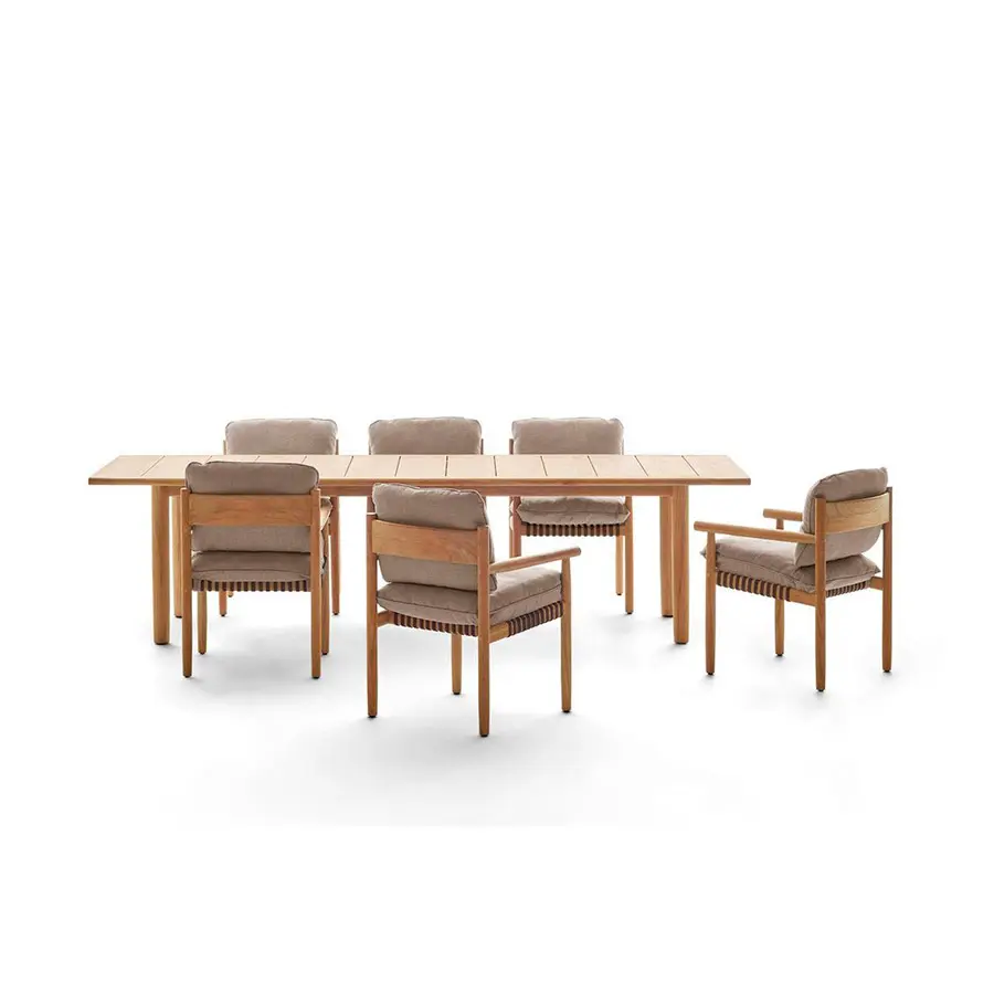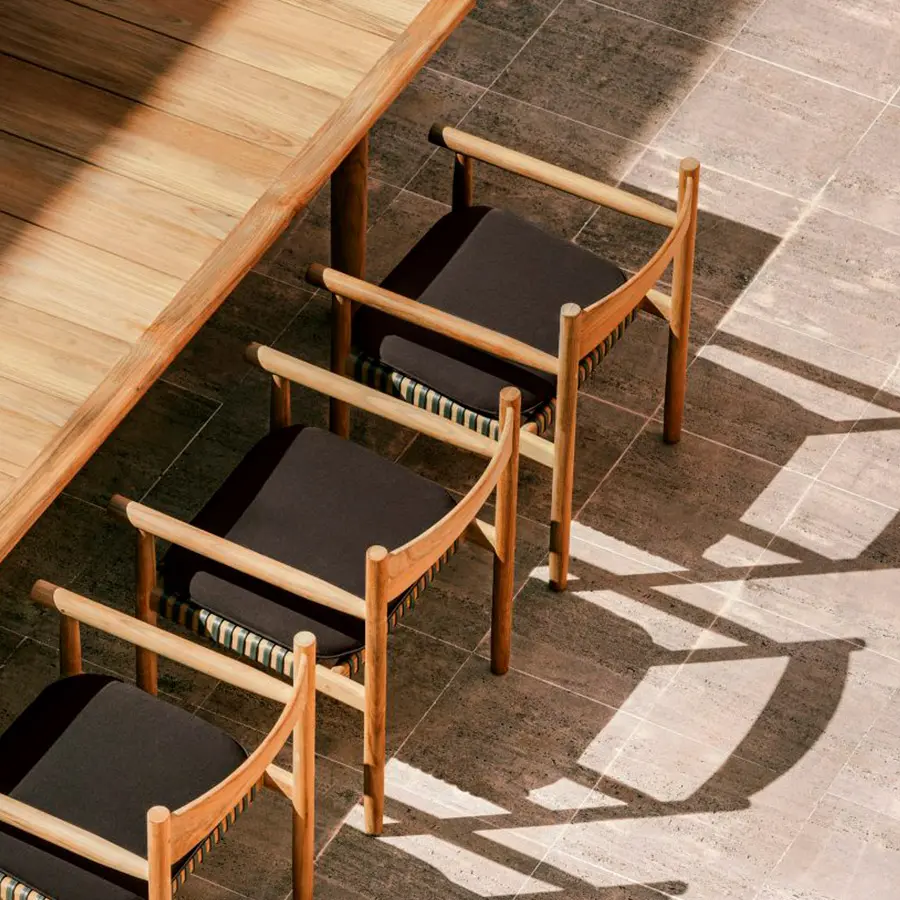 Las sillas TIBBO se distinguen por sus brazos y patas redondos, así como por la curva tridimensional de estilo marinero de su respaldo fino y moldeado. «La belleza de la madera torneada tiene una calidad táctil imposible de encontrar en otros materiales», explican los diseñadores. «Debido a la naturaleza aceitosa de la teca, la madera ofrece una sensación particularmente suave, y eso es lo que nos llevó a realizar unos muebles que acentuaran esas propiedades».