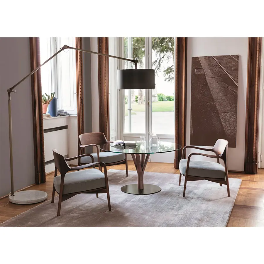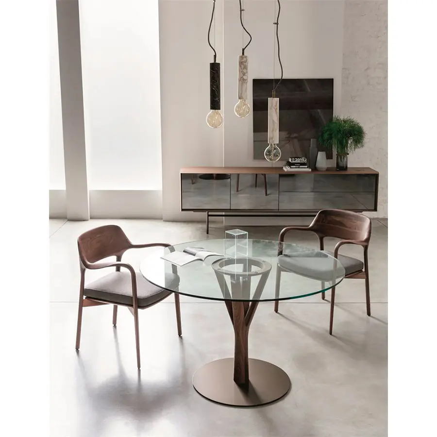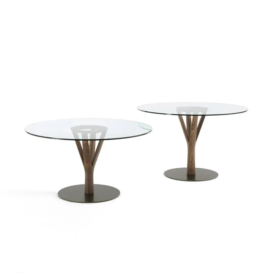 Mesa redonda con estructura central de nogal canaletta macizo montada encima de un disco de metal en acabado bronzoro y tapa de cristal templado (espesor mm. 12) con placas de ácero inoxidable pegadas UV. Disponible en redonda, diametros 80-100-120 esta mesa ofrece dos versiones en altura, la estándar de 75cm de comedor y otra versión más lounge de altura 65, ideal para combinar con butacas.