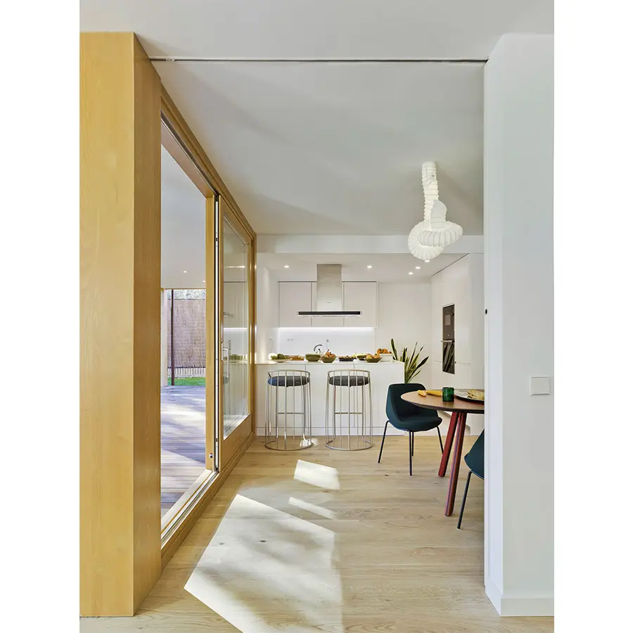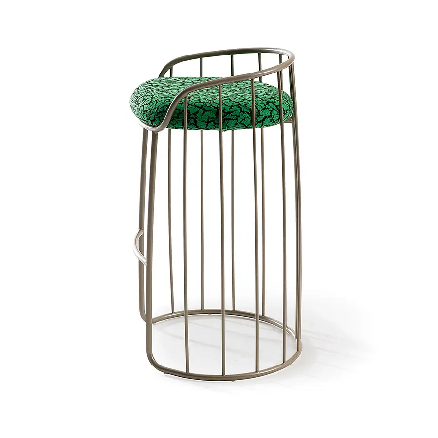 La almohada de asiento, tapizada en tela o piel, adopta una recatada presencia y dota de una estética liviana, casi etérea, a la totalidad del conjunto. La base está disponible en dos alturas y dos acabados metalizados: bronce y nácar.