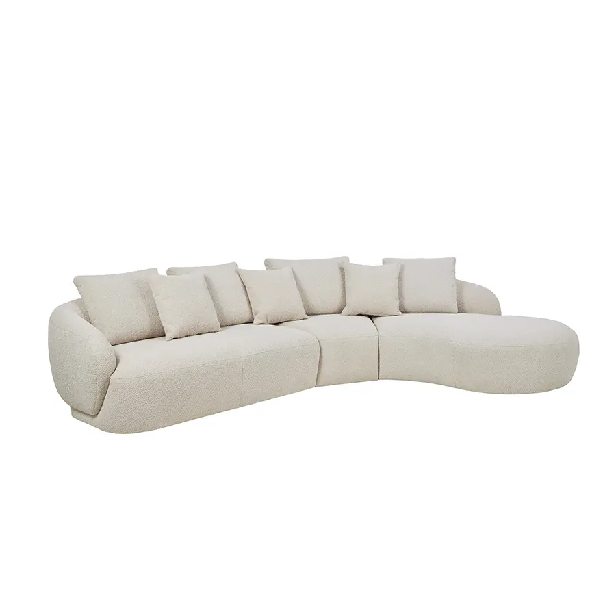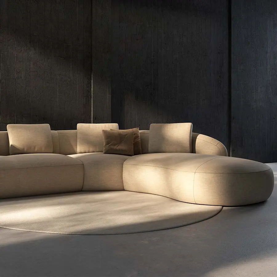 Si quieres un espacio armonioso y elegante, elige tonos neutros o tierra para el sofá y complementa con acentos de color en azul profundo, terracota o verde oliva. Para ambientes amplios, considera ubicarlo como separador de espacios: su diseño 360º lo hace atractivo desde cualquier ángulo. Si el entorno es más pequeño, opta por una versión más compacta y combínalo con mobiliario de líneas ligeras y patas elevadas.