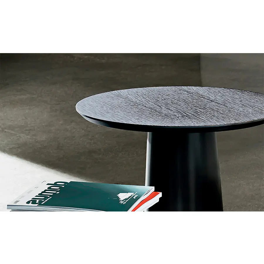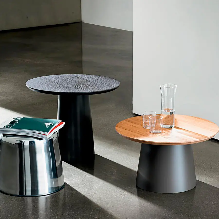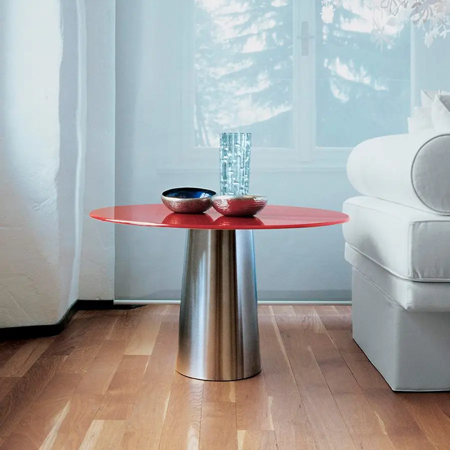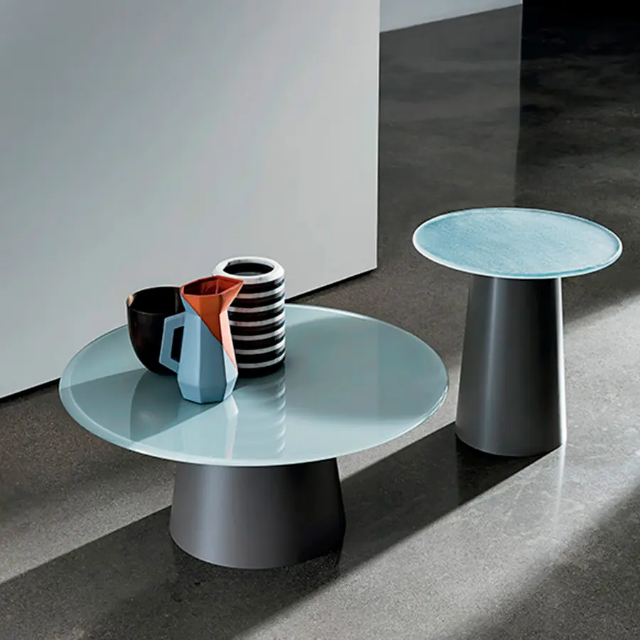 Una base de metal lacado se une con una tapa de vidrio, madera, cerámica o Materia, para dar vida a las mesas.