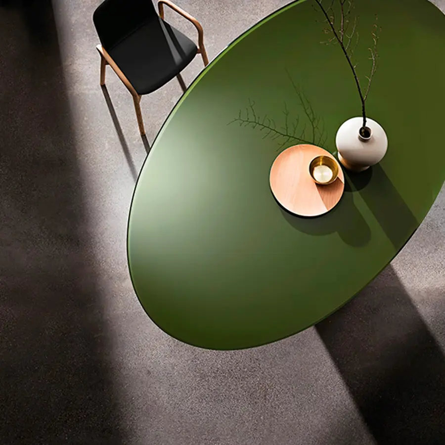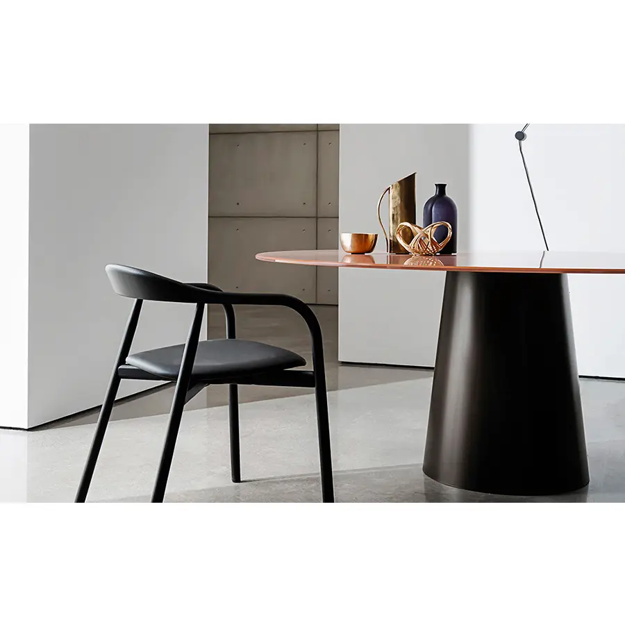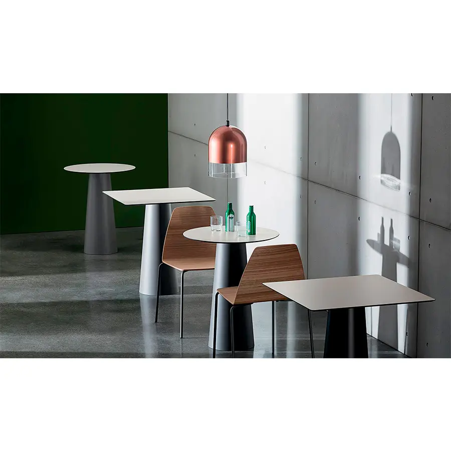 Mesa de comedor con base de metal cromado o lacado en diferentes acabados. Encimera de cristal templado o madera laminada en