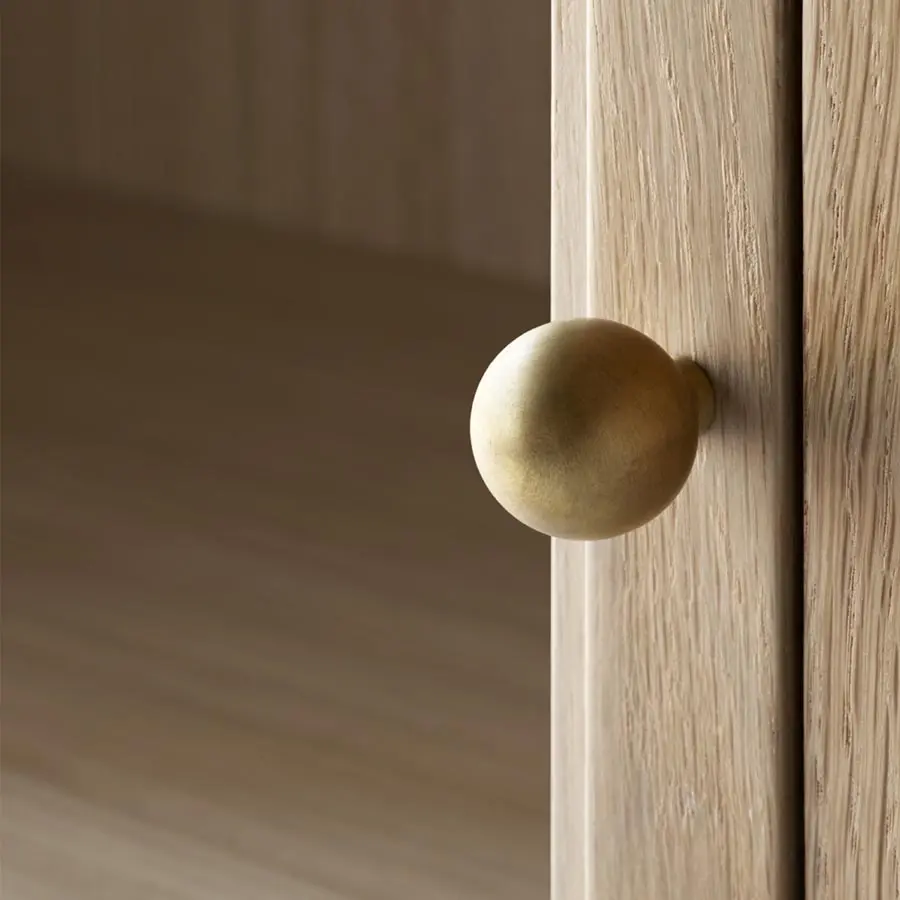 Fabricada en roble macizo y chapa de roble, puertas con paneles de vidrio, pomos de acero en bronce y bisagras de latón.