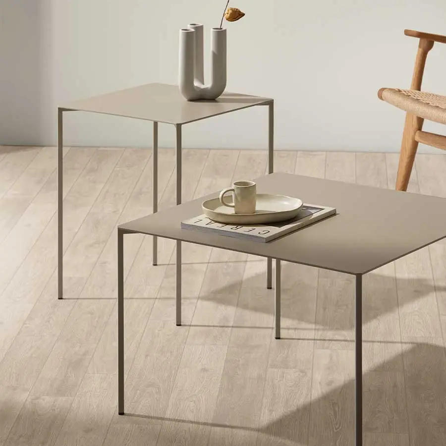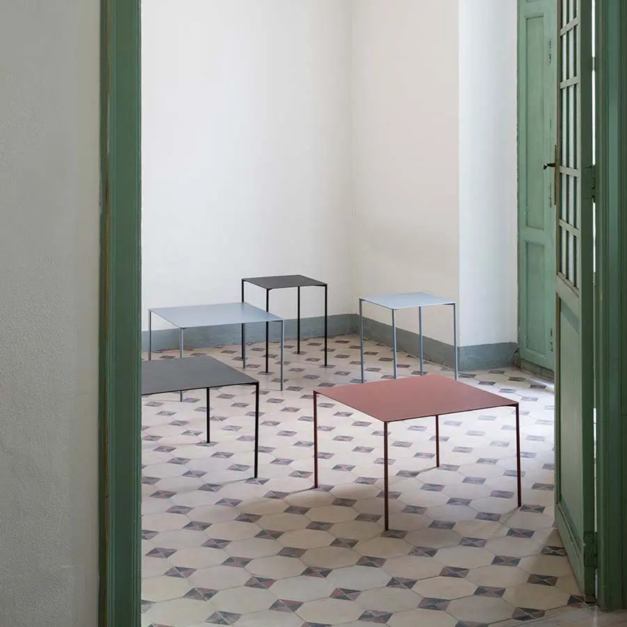 Las mesas de centro están realizadas en metal lacado o metal termolacado microtexturado negro o blanco. Está disponible en una gran variedad colores para adaptarse a cualquier proyecto. Trazo es una mesa de líneas aparentemente sencillas que nos descubren un juego muy sugerente mediante los encuentros de la tapa con sus patas.