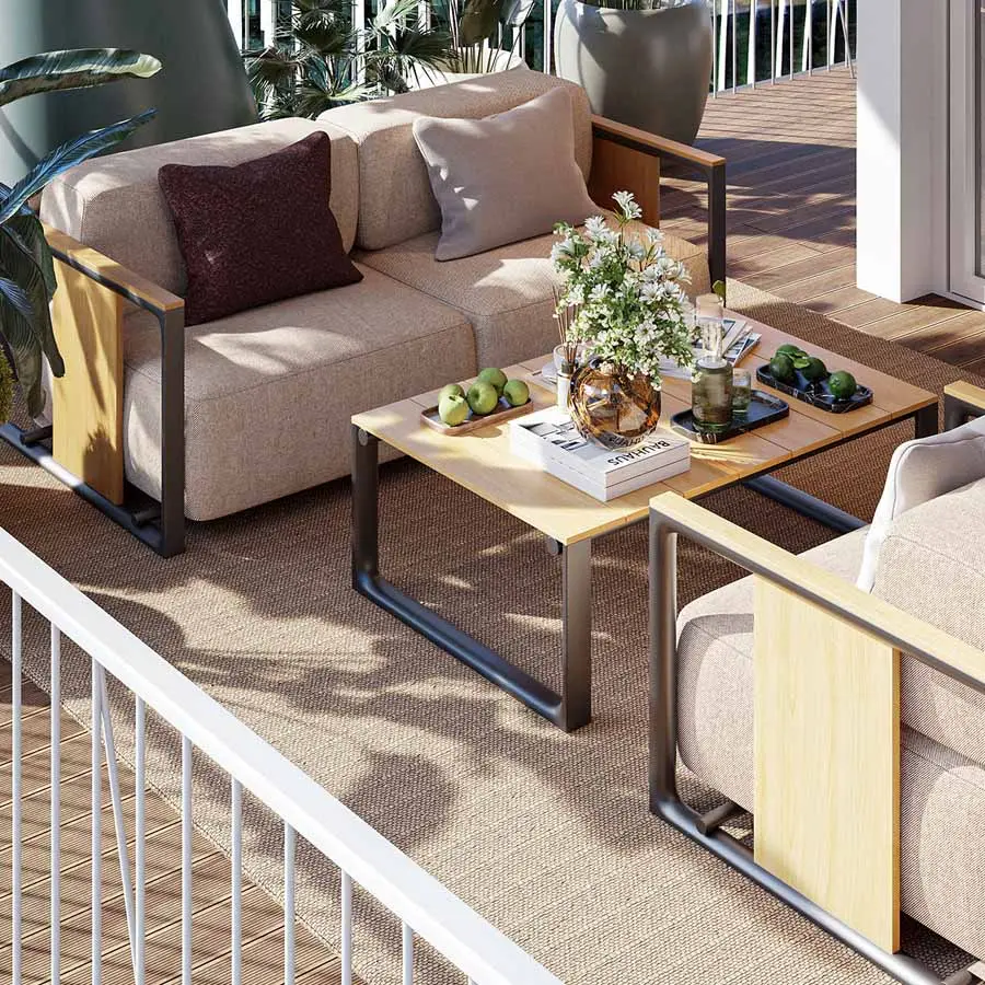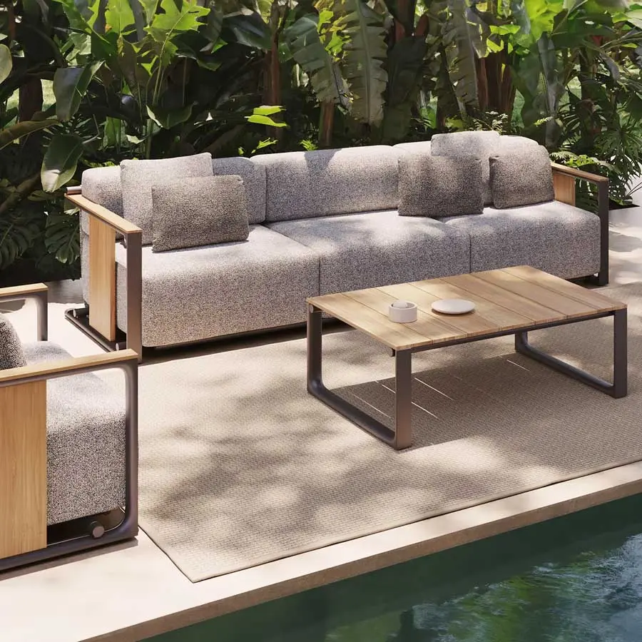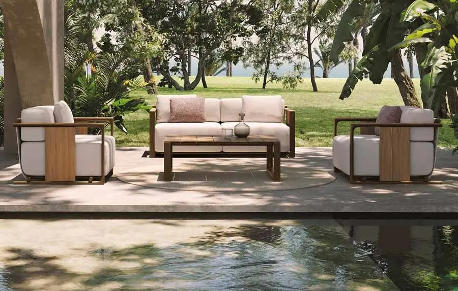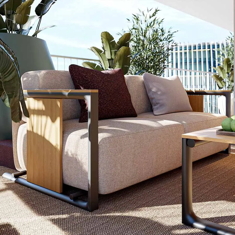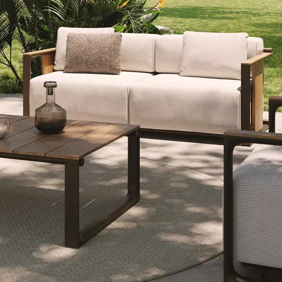 Esta colección de muebles de diseño es el equilibrio perfecto entre materiales naturales y alta tecnología que se funden en una harmonía elegante y moderna que no pasa desapercibida. Como un atardecer o una noche mágica en tu paisaje preferido. La colección destaca por los detalles en madera de teca, el material natural de exterior por excelencia. Resistente a cualquier condición climática, incluso aquellas más extremas.La perfilería de aluminio de cada pieza está extrusionada ad hoc para la colección.