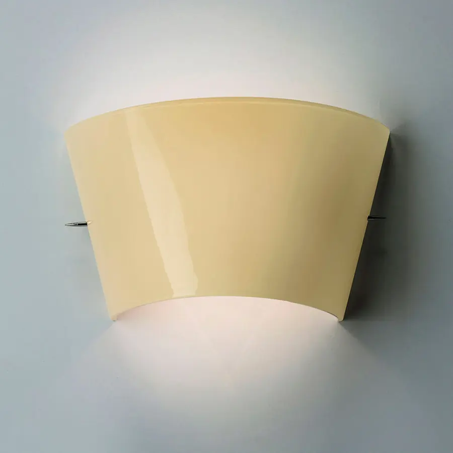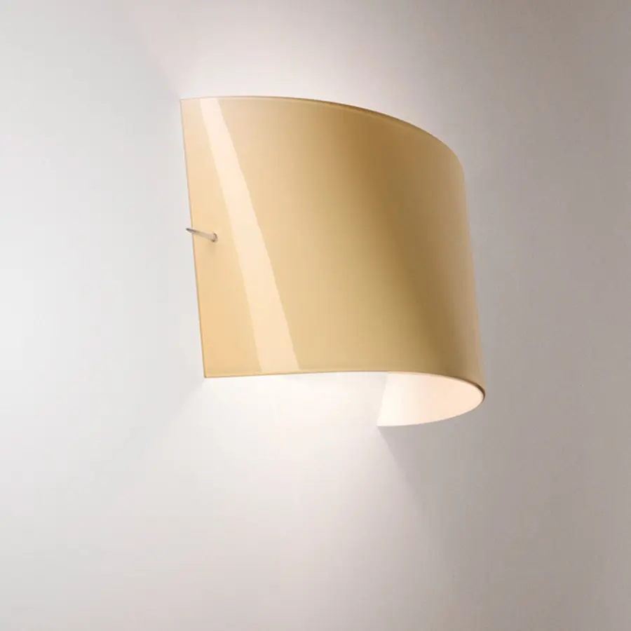 Lámpara de pared de luz indirecta y difusa. Una sencilla banda en vidrio soplado que se dobla y describe el perfil de un suave volumen que acoge la fuente luminosa. Se trata de Tutu: un aplique que mantiene juntos el difusor y la montura con un agujón, una estructura que recuerda el moño de una bailarina. Su forma es asimétrica porque los dos lados paralelos tienen dos longitudes distintas y hace que sea todavía más versátil: se puede montar con el lado largo hacia arriba o hacia abajo. Tutu emite en la pared un haz luminoso intenso hacia arriba y hacia abajo y a través del difusor proyecta en el ambiente una luz cálida.