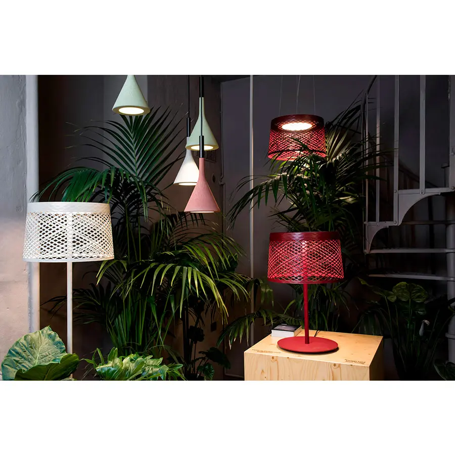 Lámpara de mesa de exterior de luz directa hacia abajo. Difusor y poste en material composite sobre base de fibra de vidrio pintado con líquido. El difusor está hecho de tiras de material compuesto modeladas manualmente sobre el molde, las cintas superpuestas crean la superficie trenzada que sucesivamente se pinta a mano.