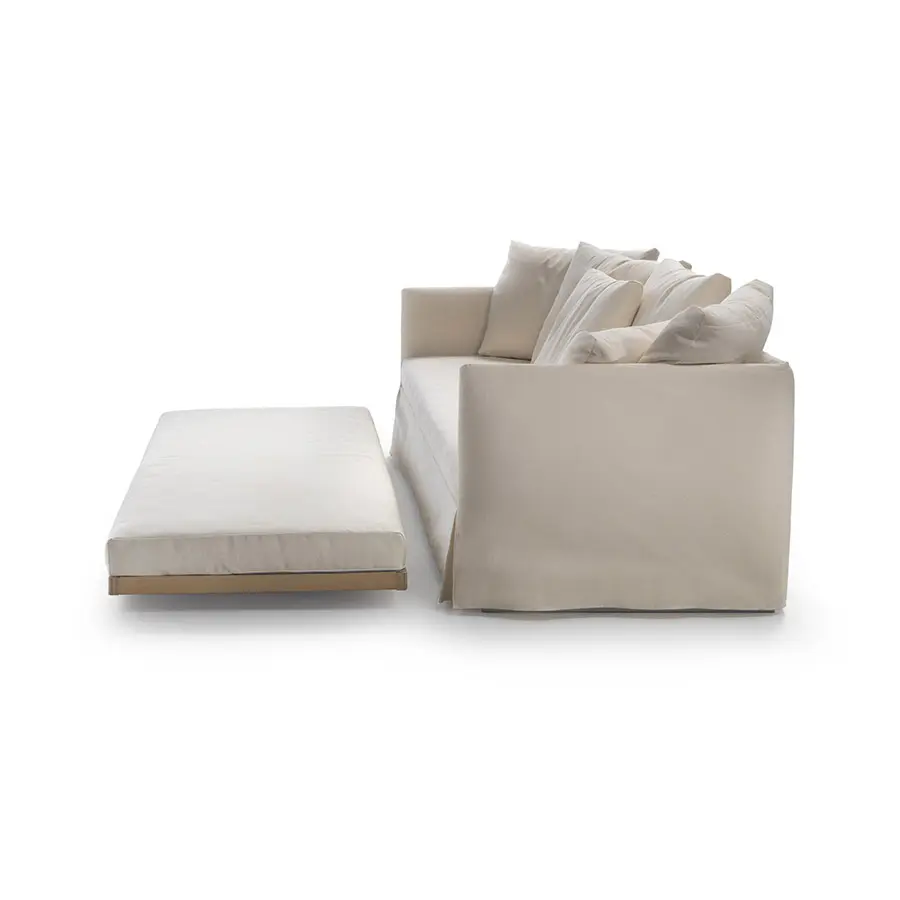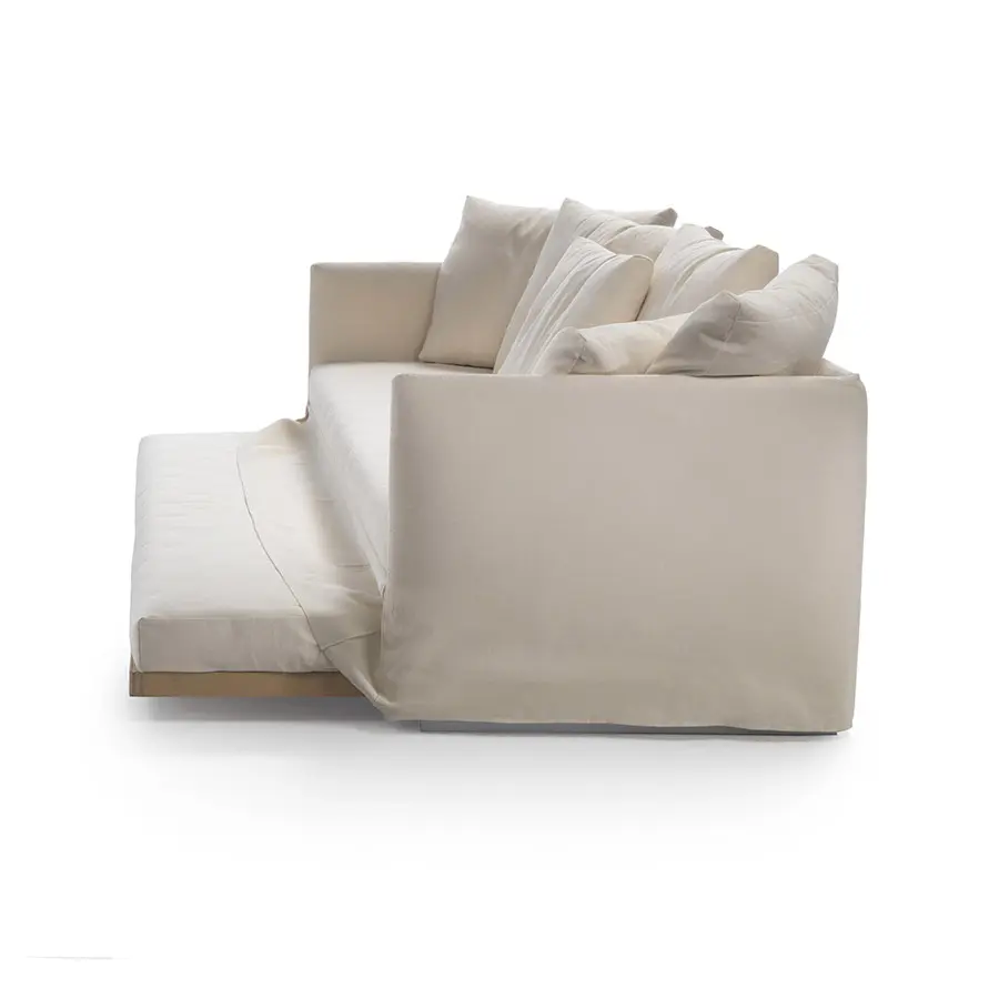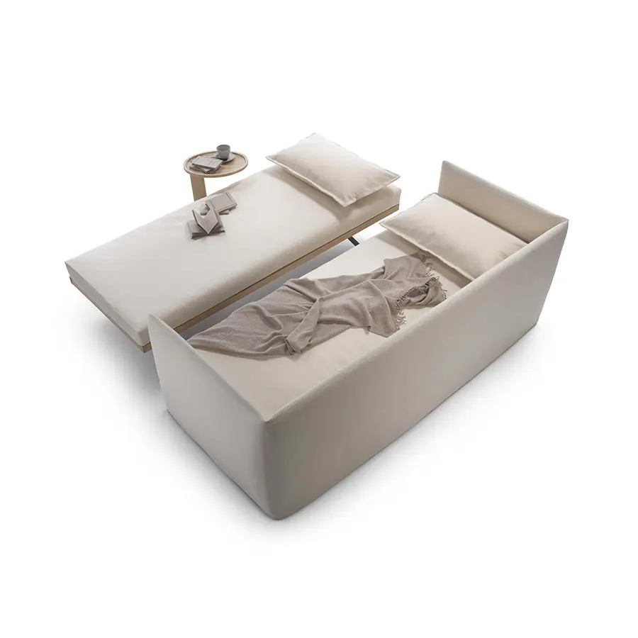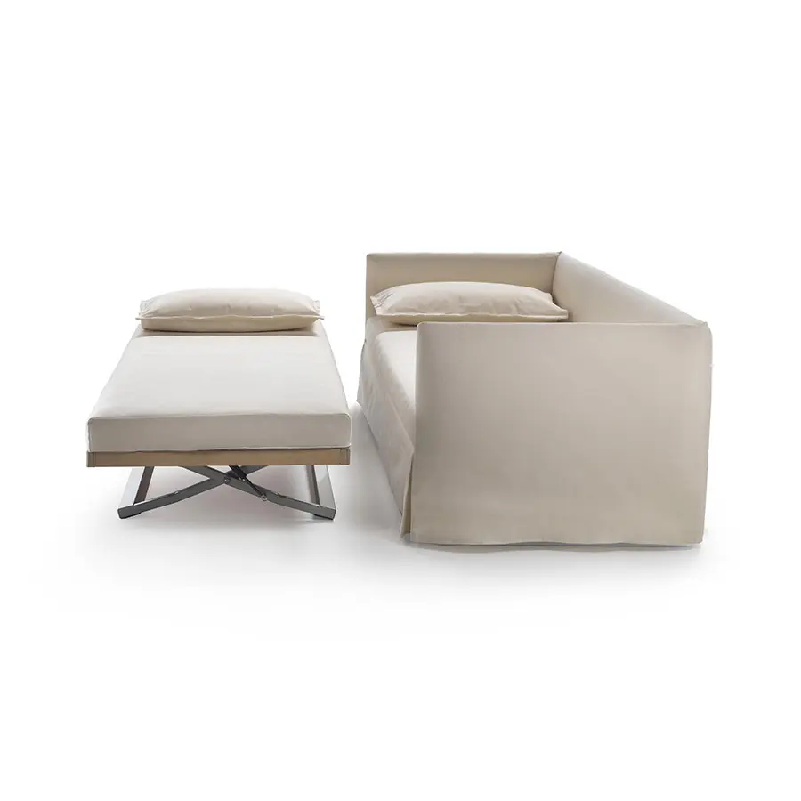 Twins es un sofá cama con dos camas individuales, que se distingue por su elegancia formal y unas proporciones equilibradas y que se adapta armoniosamente a cualquier estancia. Se caracteriza por una estructura esencial y rectangular de metal y madera y un respaldo con relleno de poliuretano y tapizado con tela a juego. Los suaves cojines acolchados otorgan al sofá cama un aspecto particularmente acogedor. La segunda cama se extrae realizando un movimiento de elevación con un mecanismo patentado activado por un simple toque del pie.