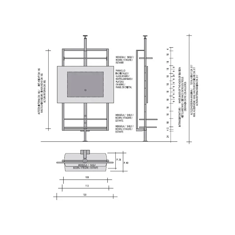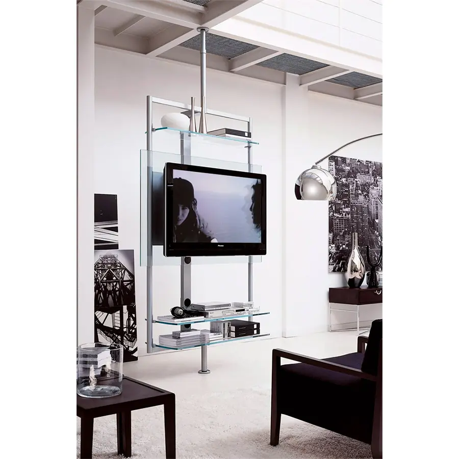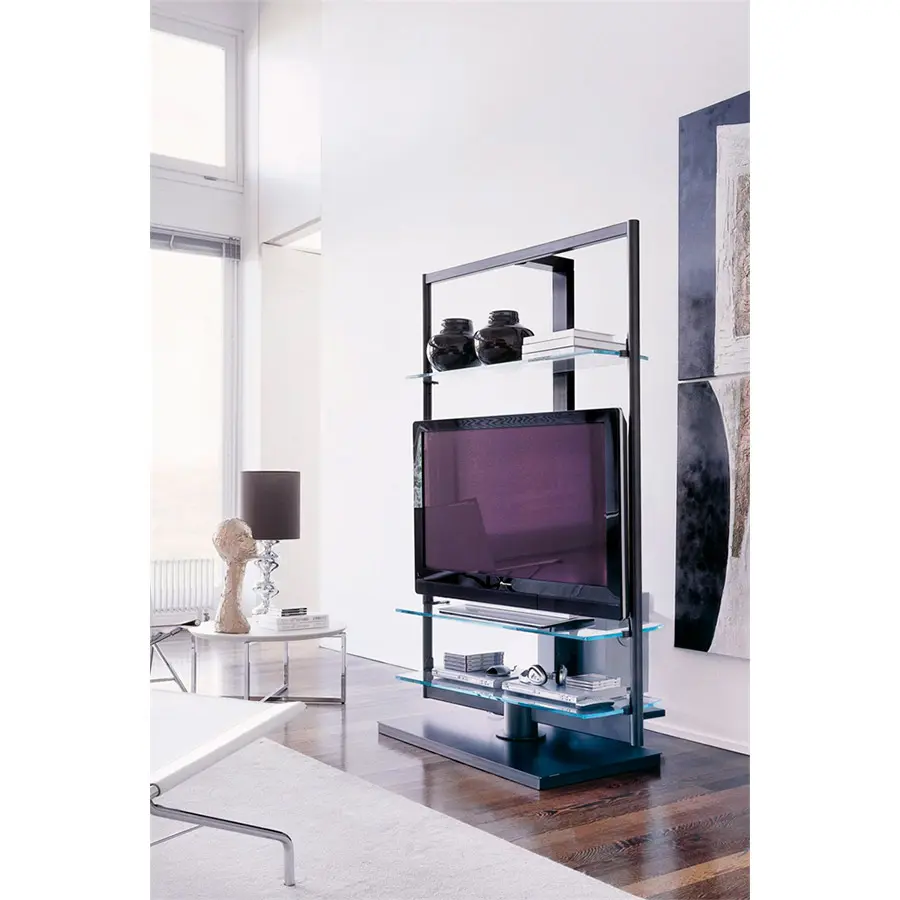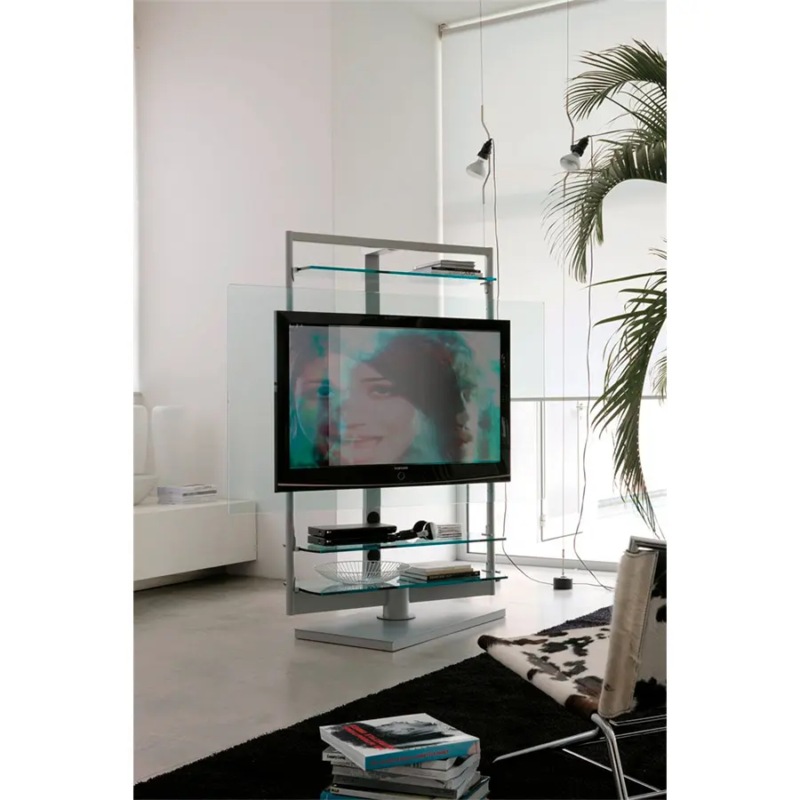 Porta TV con estructura de metal componible con varios accesorios de cristal o de madera.