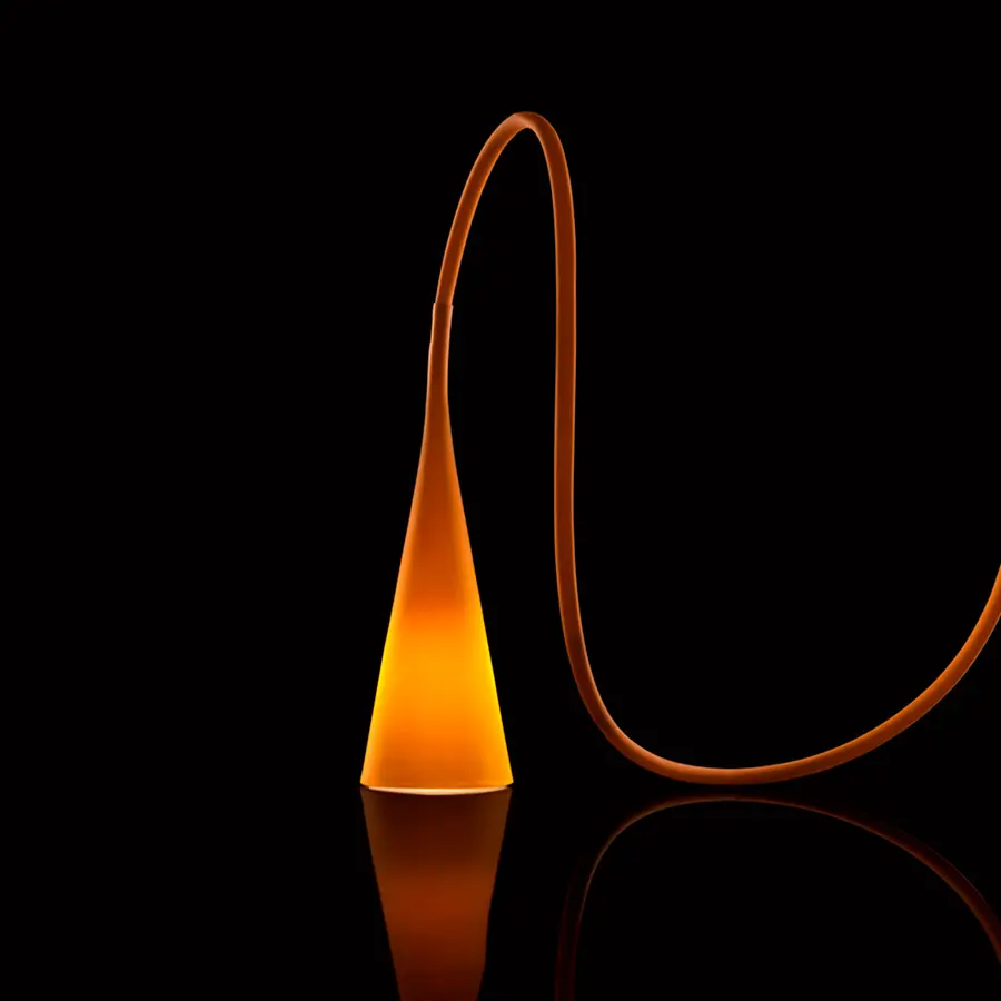 Lámpara de mesa, de apoyo y de suspensión con luz difusa y directa. Difusor cónico y tubo en elastómero termoplástico, cono moldeado por inyección y tubo realizado por extrusión. Difusor interior cónico en policarbonato opalino, escudo en policarbonato translúcido. El aparato se entrega con borne para uso externo IP44, en el embalaje se incluye una clavija para la adaptación a lámpara de interior y las instrucciones para acortar el tubo. El interruptor on/off se encuentra dentro del tubo en el empalme con el cono difusor.