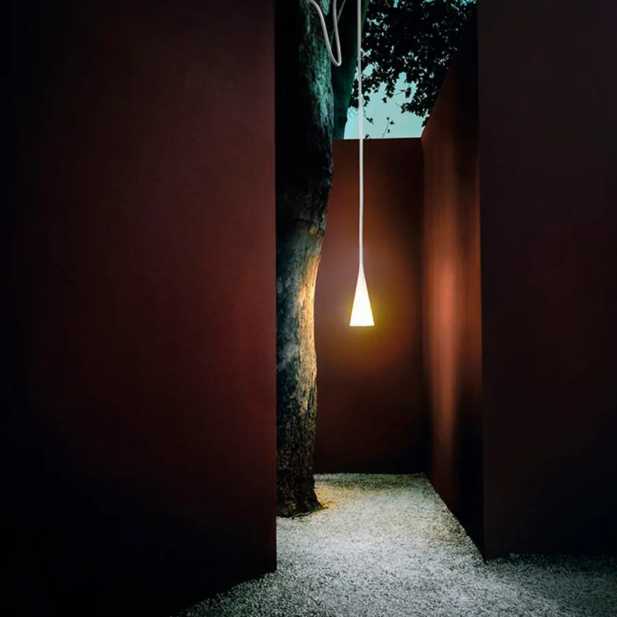 Lámpara de mesa, de apoyo y de suspensión con luz difusa y directa. Difusor cónico y tubo en elastómero termoplástico, cono moldeado por inyección y tubo realizado por extrusión. Difusor interno cónico en policarbonato opalino, escudo en policarbonato translúcido. El aparato se entrega con borne para uso externo IP44, en el embalaje se incluye una clavija para la adaptación a lámpara de interior y las instrucciones para acortar el tubo. El interruptor on/off se encuentra dentro del tubo en el extremo del cono difusor.