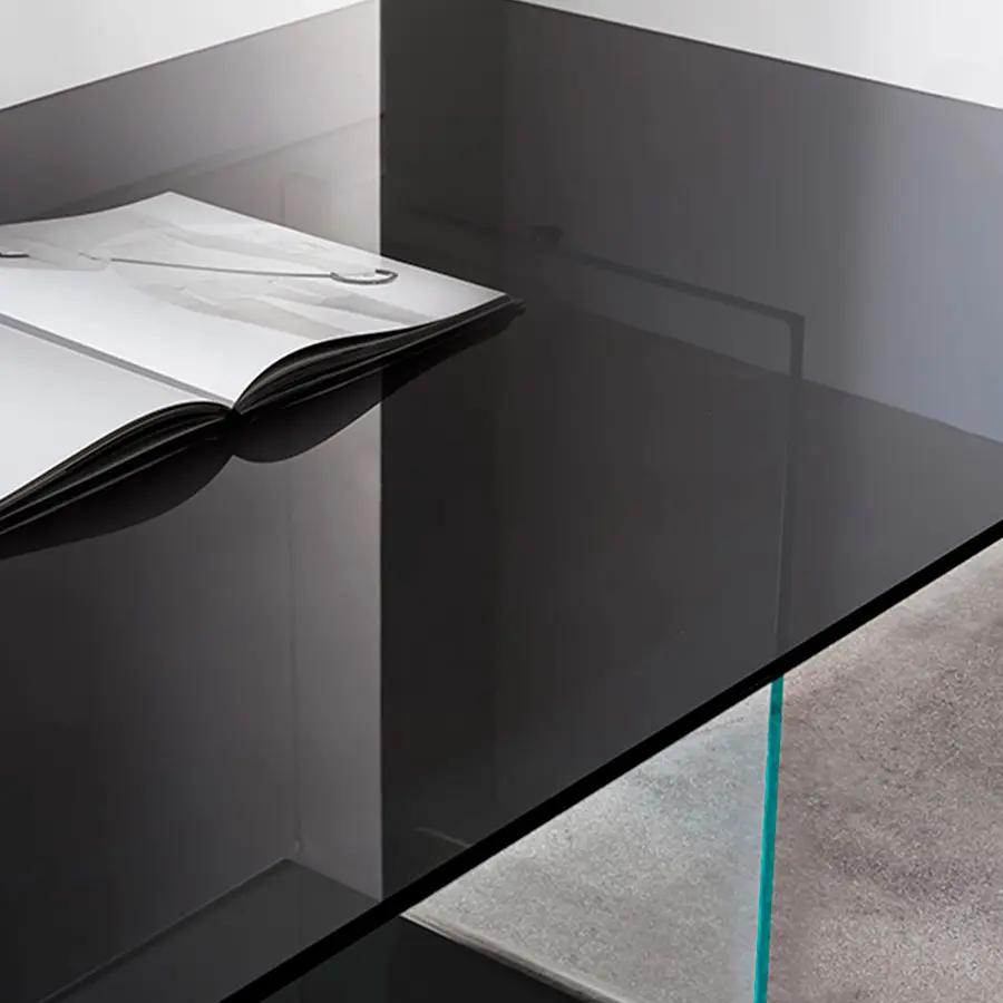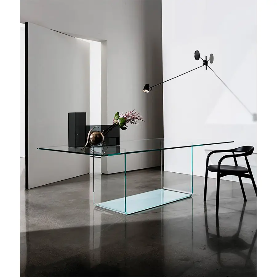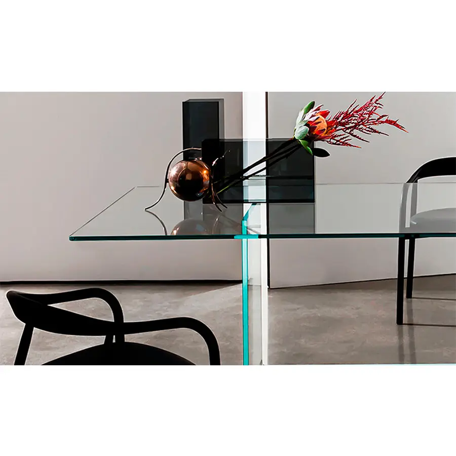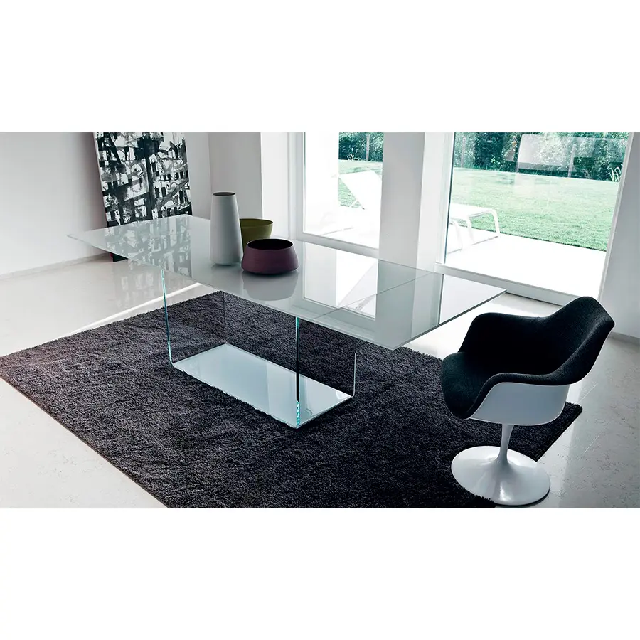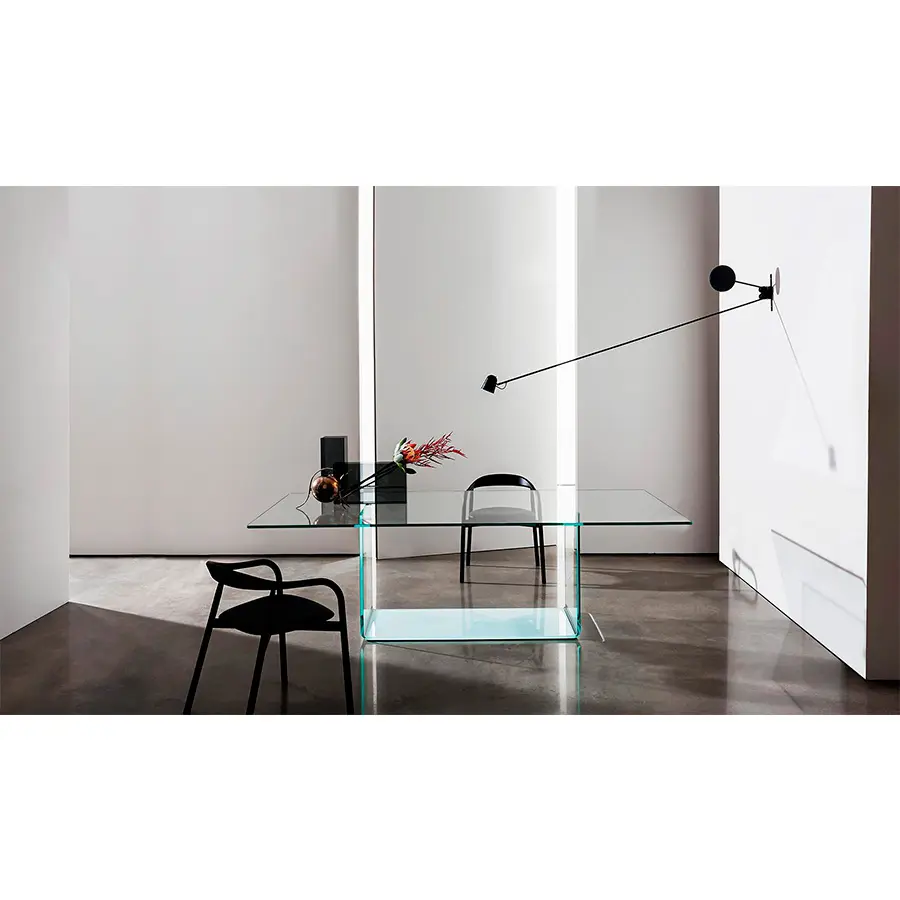 La mesa de comedor Valencia tiene una base de vidrio doblado extraligero y esta disponible en distintos acabados.