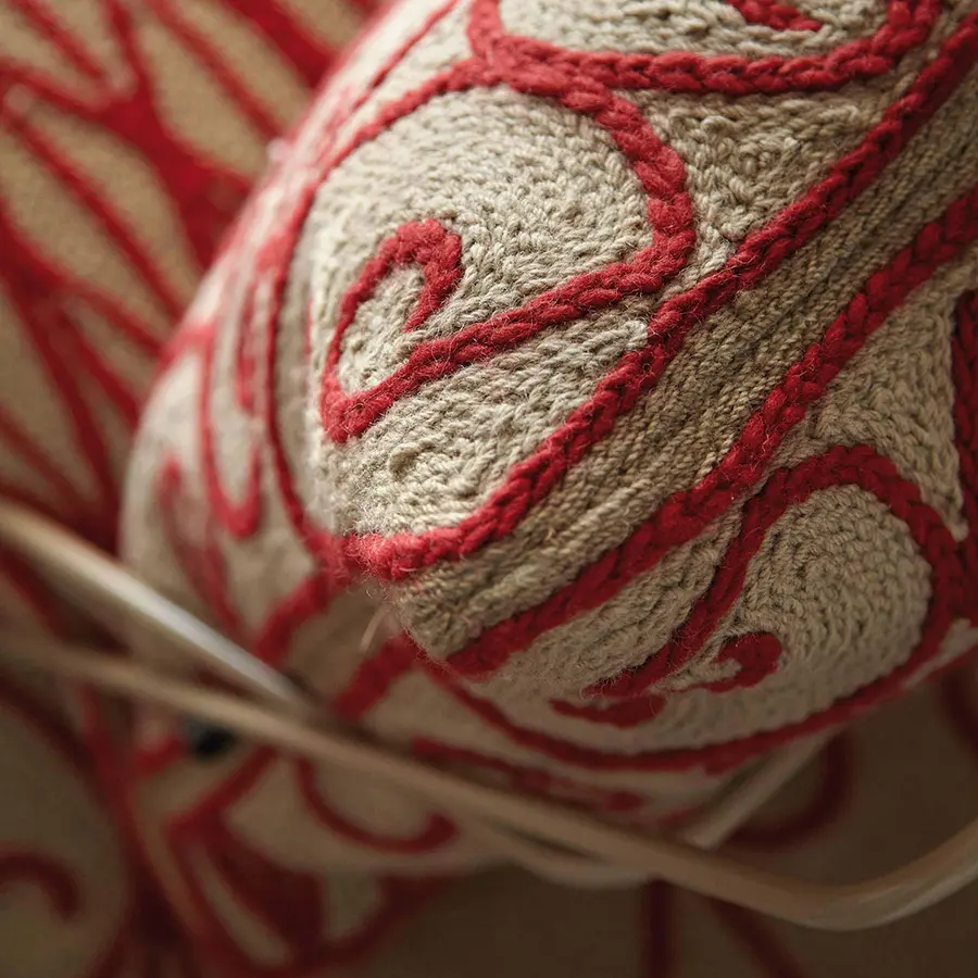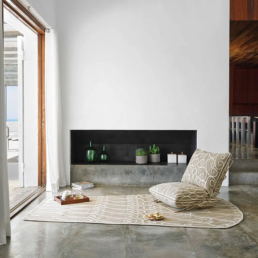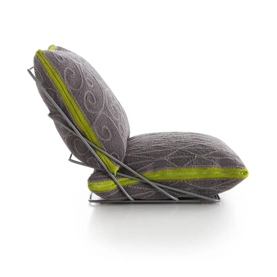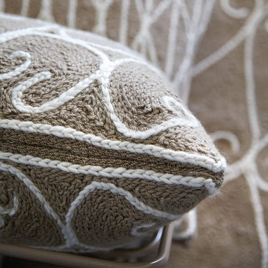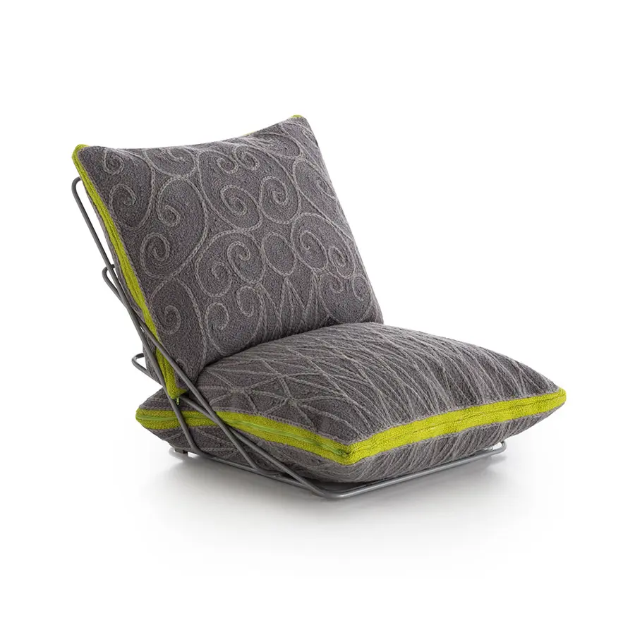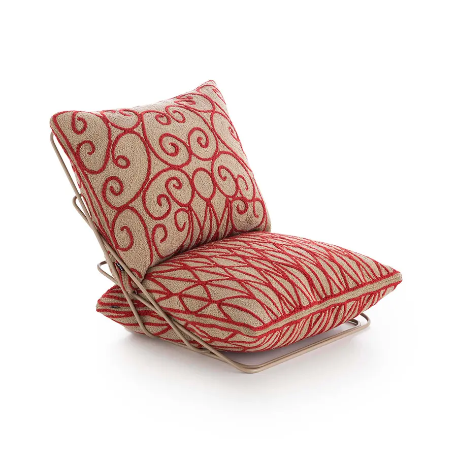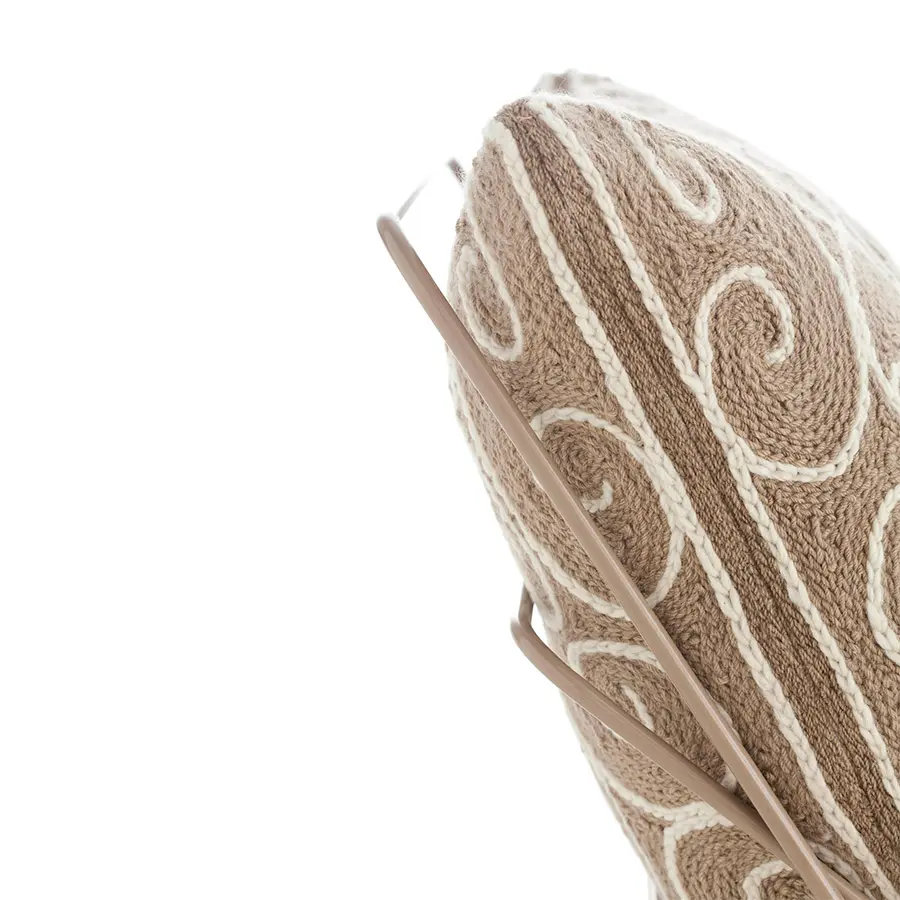 Esta es la butaca a ras del suelo de nuestra colección Valentina, un diseño concebido con tan solo dos cojines y una liviana estructura de varillas de acero. El tejido que recubre tanto el cojín que hace de asiento como el que funciona de respaldo, tiene una textura y un tono marrón claro similar a los de las artesanías elaboradas con esparto. Sin embargo, está confeccionado enteramente con 100% lana virgen, incluido su motivo en color crudo que recuerda a los tradicionales adornos de las rejas de forja artística.