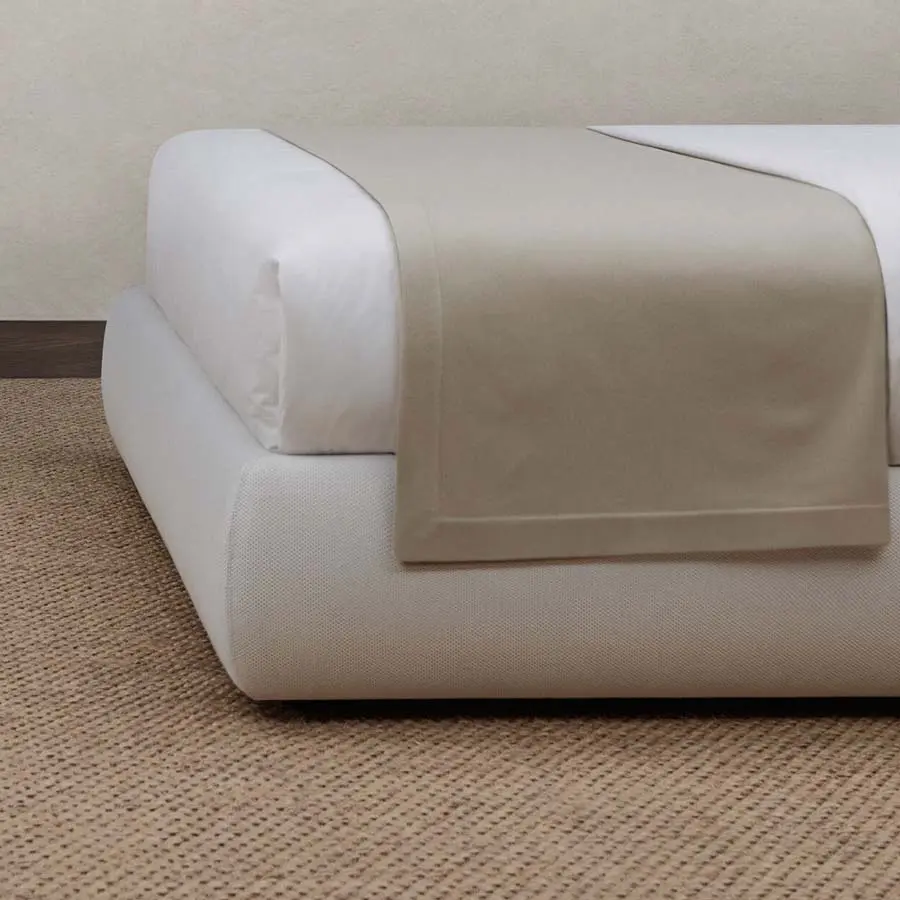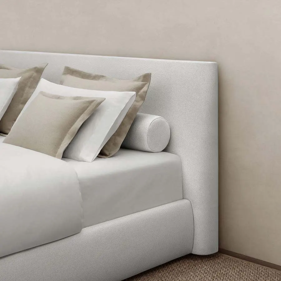 En combinación con el sofá y las butacas de la misma colección, la cama, que puede tener una base suspendida sobre patas vistas, tapizada hasta el suelo o bien con contenedor, dispone de un cabecero voluminoso y muy cómodo que conecta con el asiento del sofá y butacas de la misma familia. Esta colección incluye también cabecero independiente y sofá cama.
