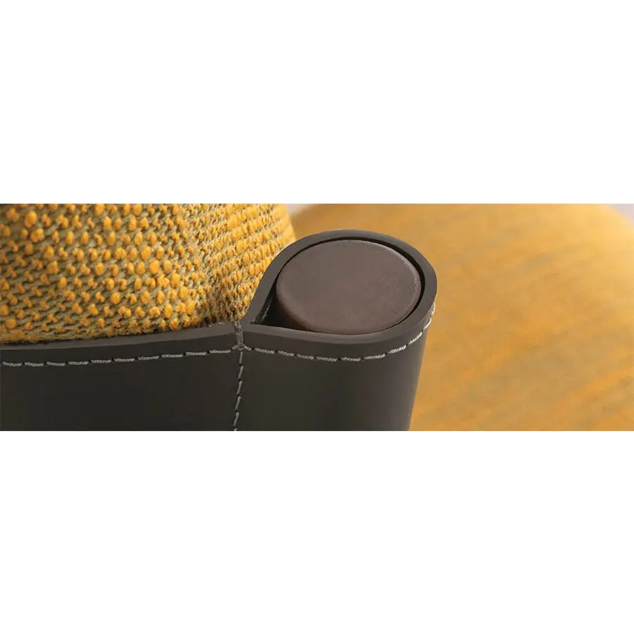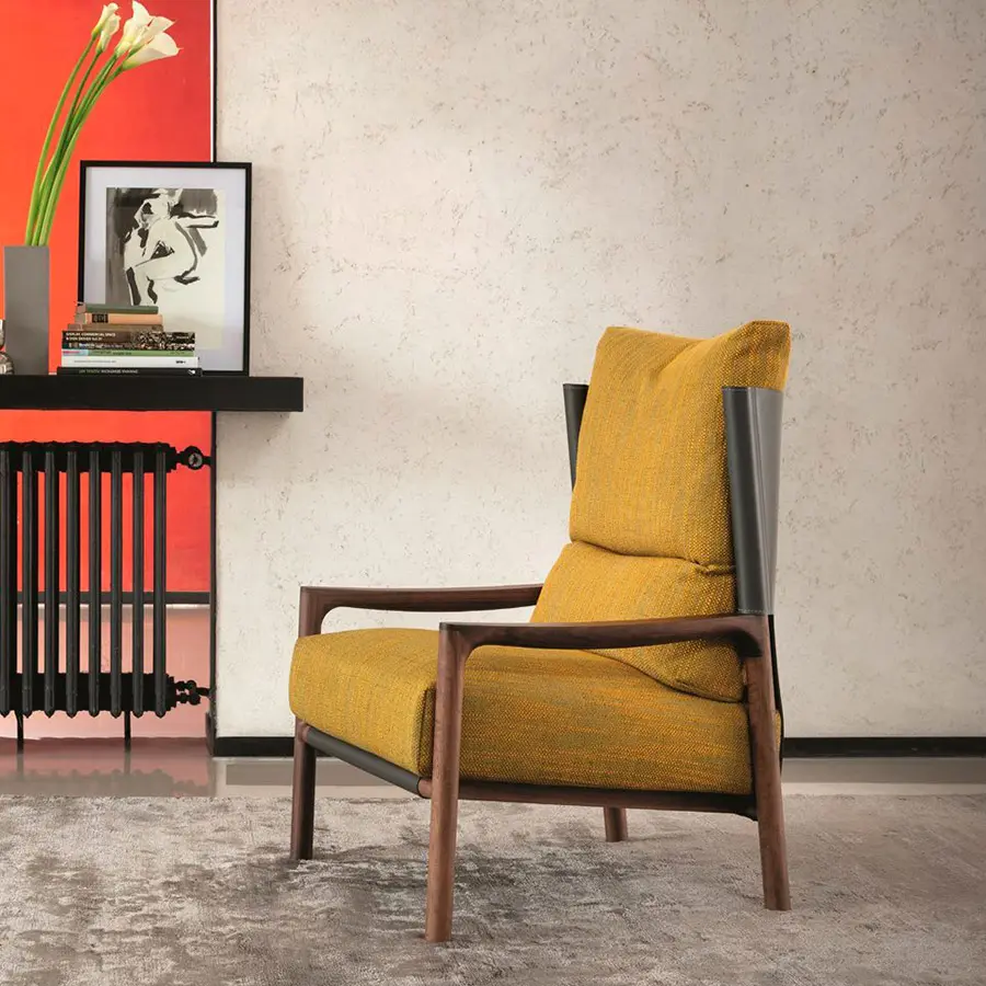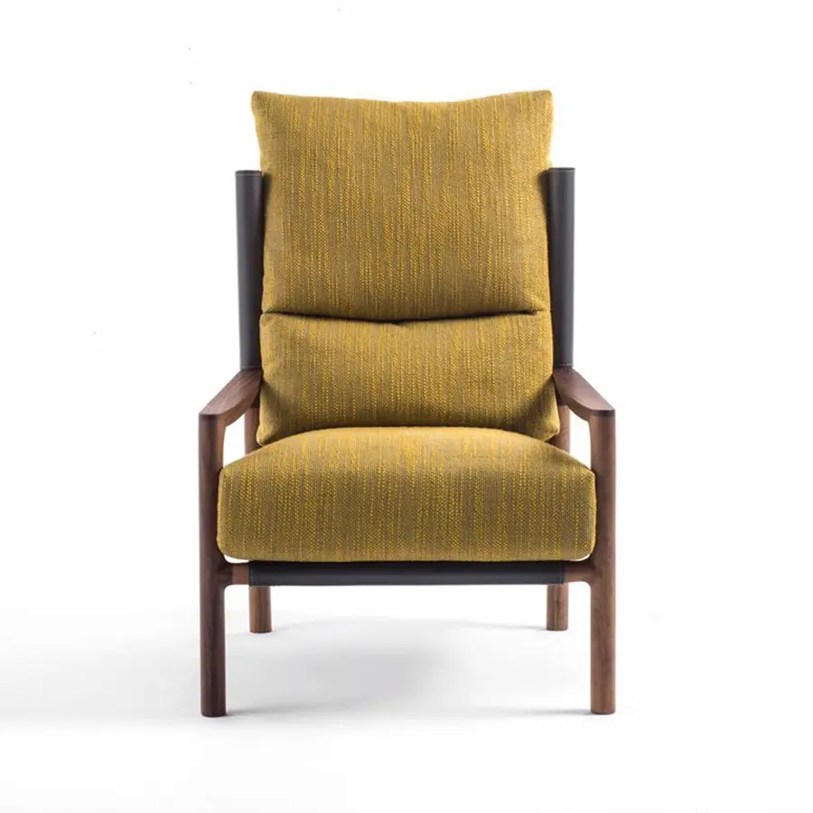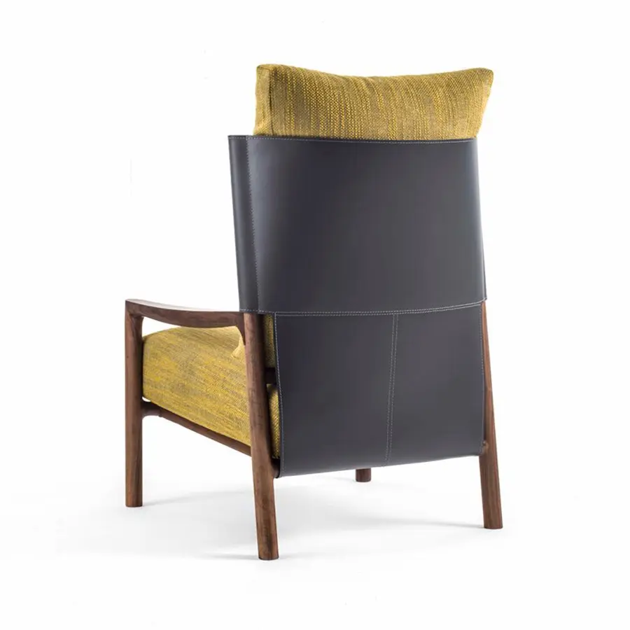 Butaca con estructura de nogal canaletta macizo, respaldo en Cuoietto y revestimiento de los cojines desenfundable en las telas de la colección.